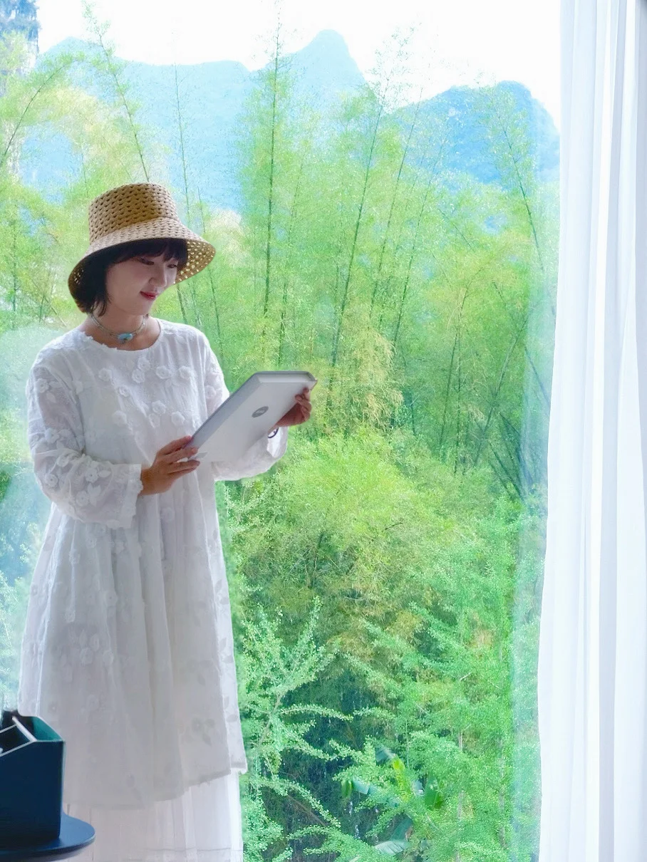 房间的落地窗把遇龙河的晨雾裁成纱帘