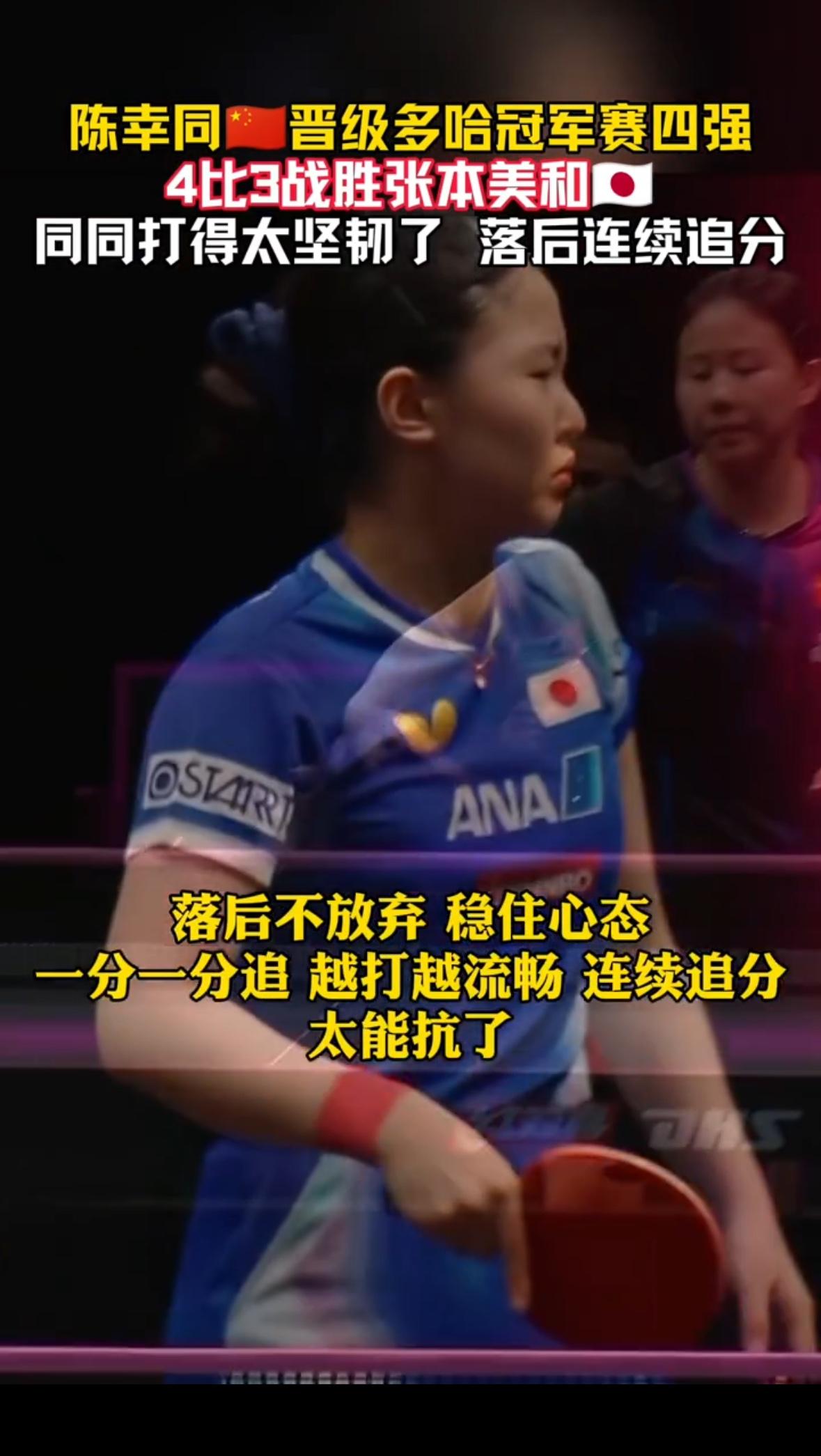 陈幸同真的强韧,就是坚持到底,晋级! 王曼昱失利,好在好在陈幸同打上了,国乒还是干将多,一个不行两个接着上,就是不怕! 太不容易了,比分咬的太紧了,多多加油给足支持,多少人心惊胆战,让同同也当了一次大女主,大心脏打到最后关头! 接下来就看蒯曼和同同同的后续表现!