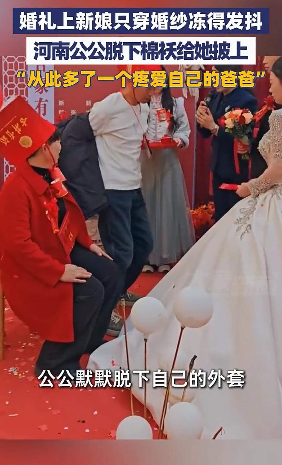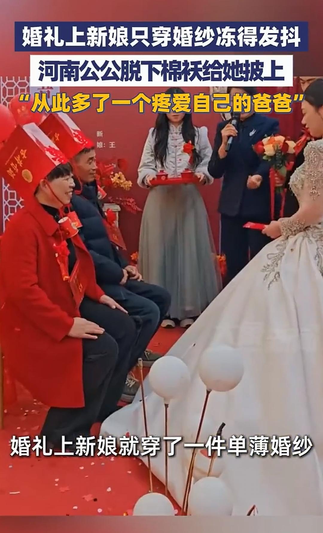 婚礼上新娘只穿婚纱冻得发抖,河 南公公脱下棉袄给她披上 婚礼现场的镜头定格在那