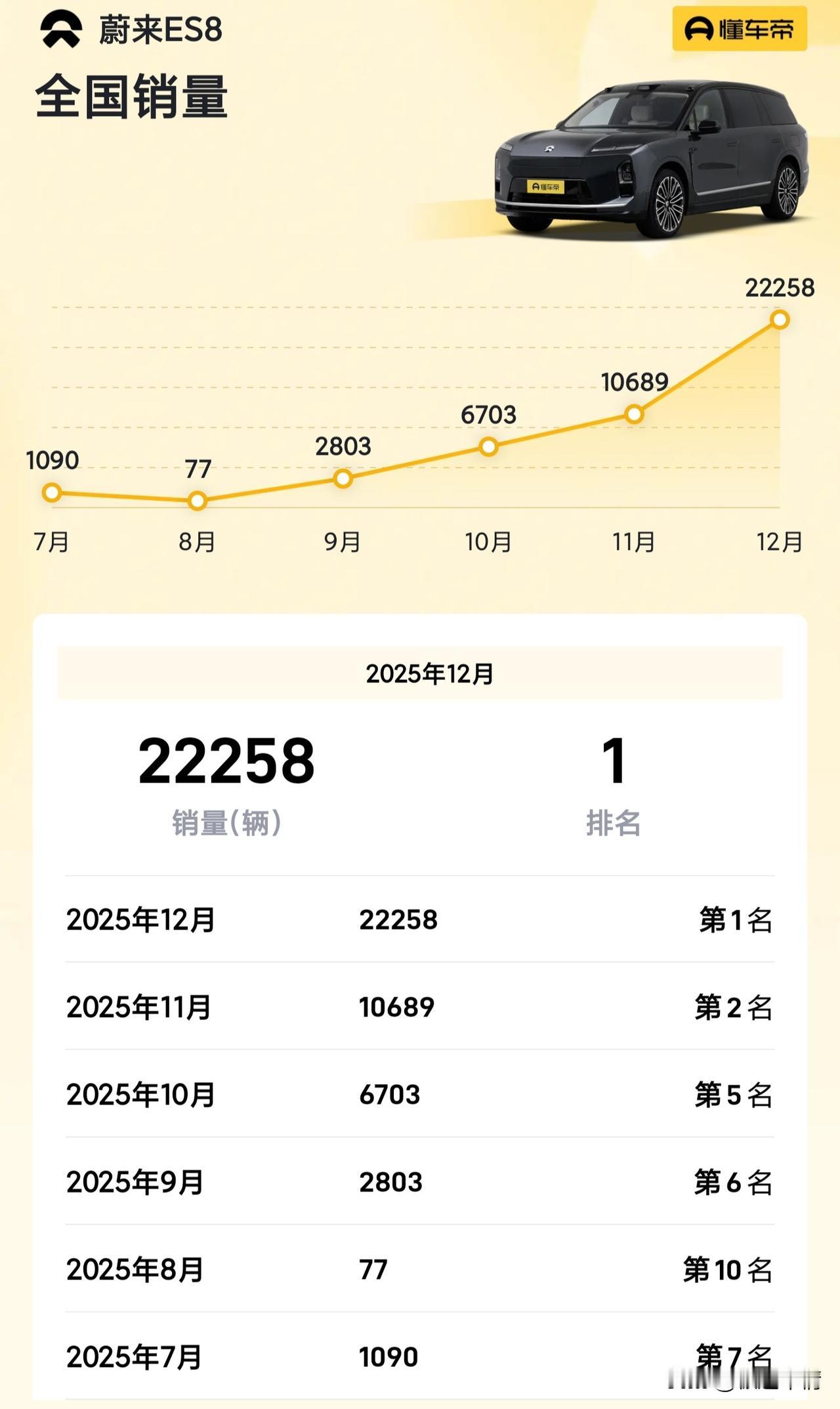 乐道L90被打回原形,蔚来新ES8一飞冲天,越贵越的越好卖?! 乐道L90销量从10月的11722辆环比暴跌到11月的5970辆,继续环比大跌到了12月的4105辆。 反之,同门大哥蔚来新ES8从11月的10689辆一飞冲天,环比暴增至12月的22258辆,登顶D级SUV榜首。 这就是同门不同命啊,就看后续乐道怎么解决订单枯竭后维持稳定月销了。蔚来新ES8目前势头很猛,我们小区都有两辆新款了,要是2026年贯穿这个势头,蔚来全年盈利的希望大增,你说呢?