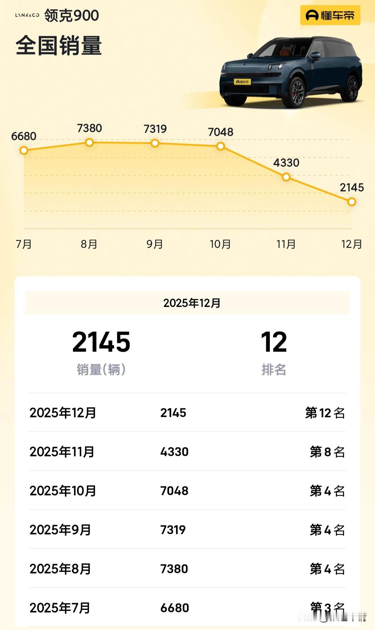 领克900跌入谷底,连续环比大跌,发生什么了?! 领克900销量在12月跌倒谷底了,只卖出2145辆,11月大跌都还有4330辆,12月环比更是腰斩! 在众多新上市30万级别大六座SUV的冲击下,领克900也没能继续稳定到7k左右的月销,当下的30万级别大六座SUV真的是贴身肉搏啊! 看看腾势N8L和智己LS9在12月稳步上涨的销量,明显分流了不少领克900的意向买家。在这个价格区间,市场就这么大,看谁家有诚意,谁家更卷,更六边形战士,才能脱颖而出长期稳定住月销量了。 而今年的大六座SUV战场,更加是腥风血雨的一年! 2026年,你看好谁能在30万级别的D级大六座SUV市场一统江湖呢? 1.理想L8 2.领克900 3.乐道L90 4.腾势N8L 5.智己LS9 6.其他