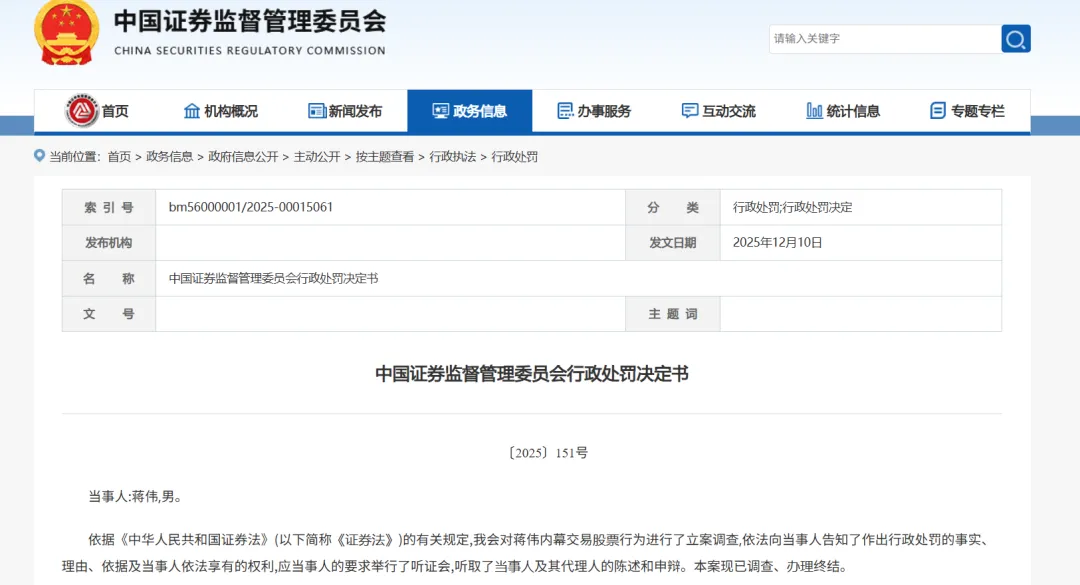 证监会日前更新披露的一则行政处罚决定书显示,蒋伟与相关内幕信息知情人存在联络接触,控制使用其本人及多个他人证券账户买入相关公司股票,内幕信息公开后全部卖出,共计获利470.97万元。