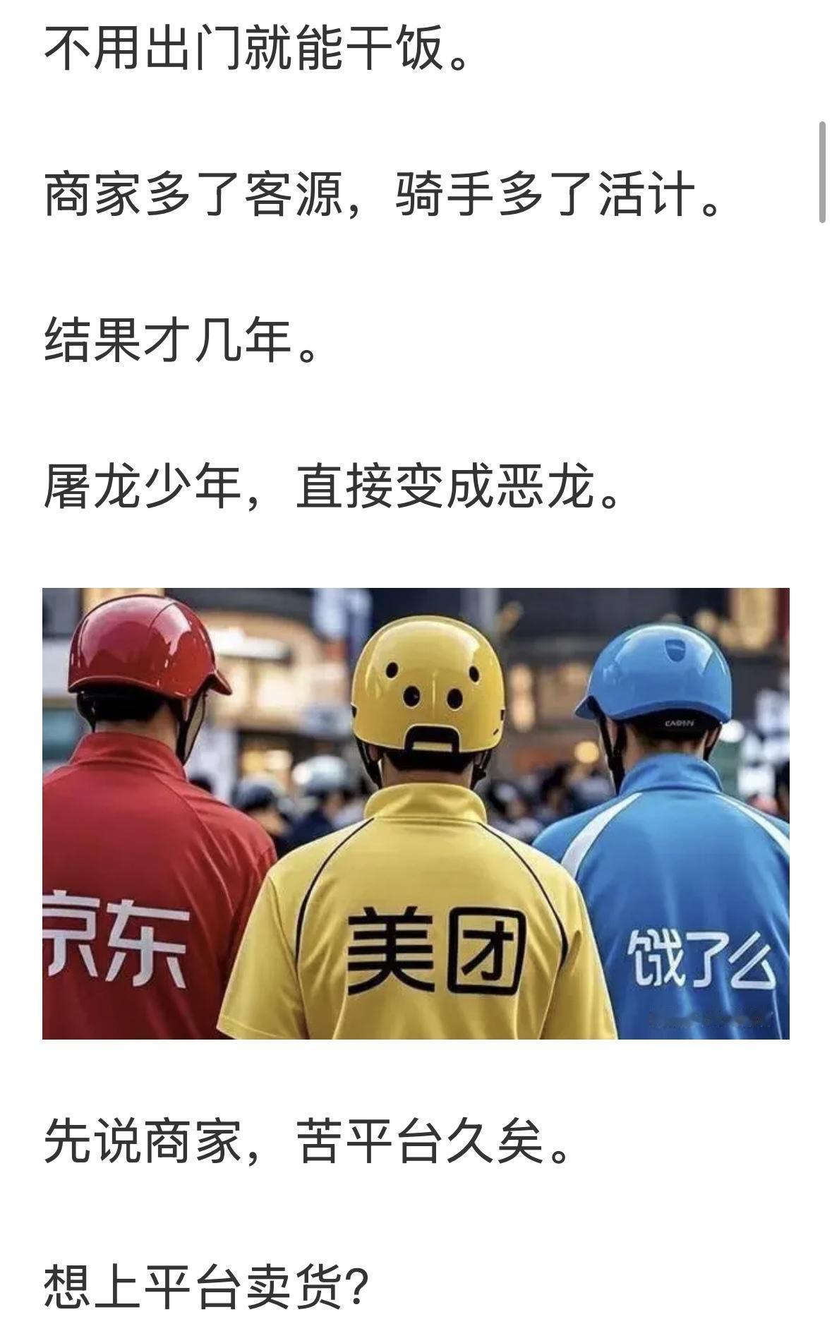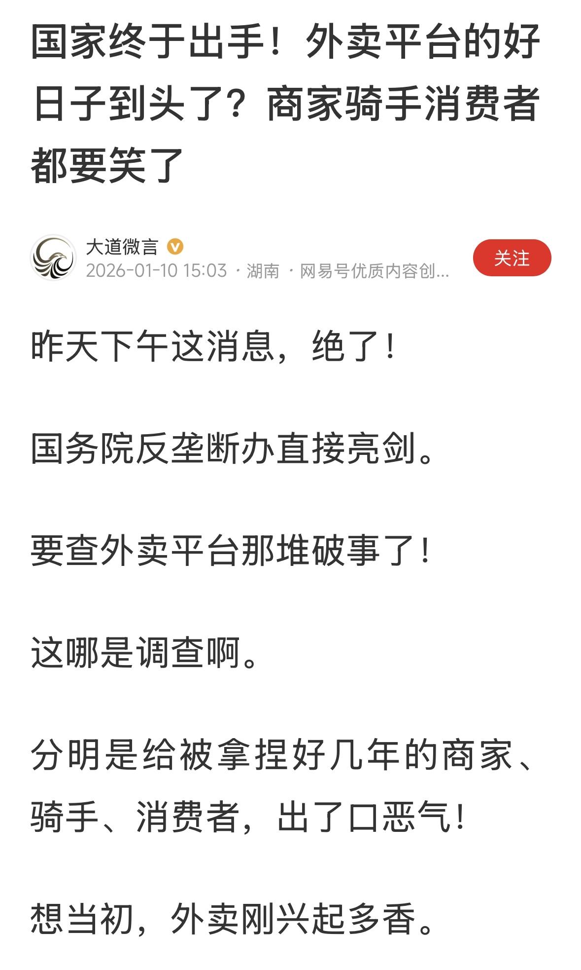 坚决反对垄断,必须保持竞争,各种市场主体都要有竞争关系,才能保证消费者和劳工的权益。网约车、快递、外卖都要有十家以上的平台竞争才行!