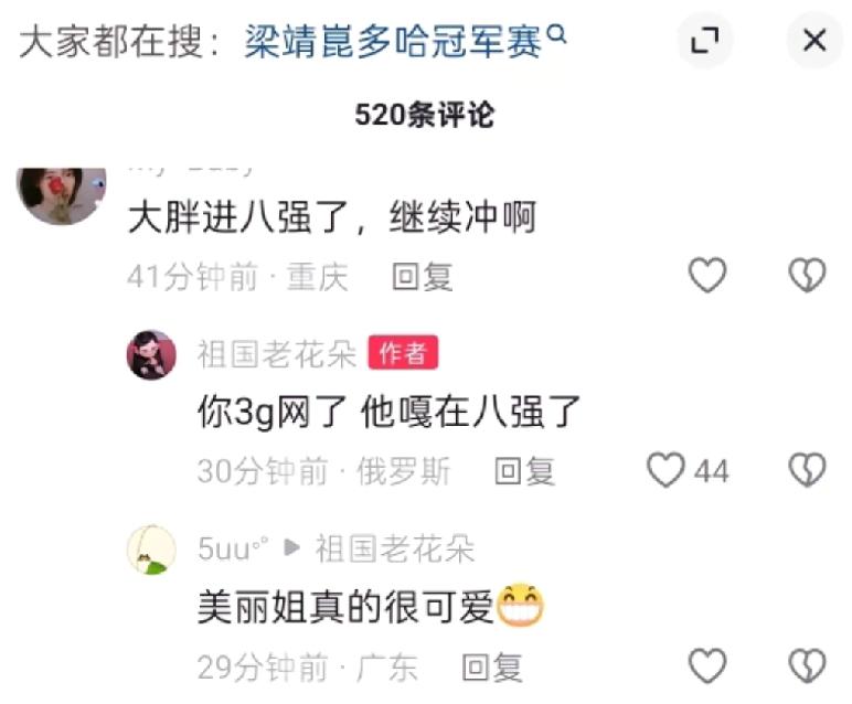 多哈冠军赛梁靖崑止步八强, 他老婆竟然说“他嘎在八强了”, 这话也就自己人敢说, 这要是哪个球迷这么说, 早就被“挖“出来了。 不过话说回来了, 甜甜的老婆还是挺幽默的, 这样的回答好可爱, 确实是亲两口子。 夫妻俩一个不言不语, 一个快言快语, 还是互补的好, 这就是绝配。 此次多哈冠军赛, 梁靖崑先是3:0阿鲁纳晋级16强, 再是3:0淘汰队友陈垣宇晋级8强。 可惜他和林诗栋遇到的太早了, 注定他俩只有一个人晋级四强。 大胖输给林诗栋, 没输外战, 其实打得挺好的, 没关系下一站继续加油! (图片源自于网络)
