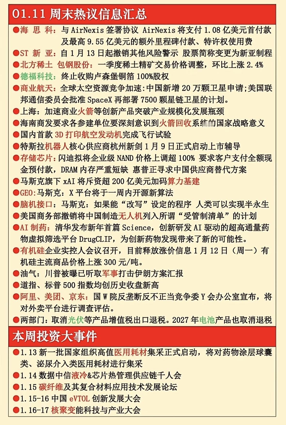1月11日周末热议消息汇总 商业航天加速,稀土涨价;AI制药突破,脑机接口引热议;光伏退税取消,医药集采启动;马斯克开源算法,特斯拉机器人供应商上市。" 商业航天加速,AI制药突破,存储芯片涨价,脑机接口引热议,反垄断调查启动,新能源政策调整,全球科技竞争升温。