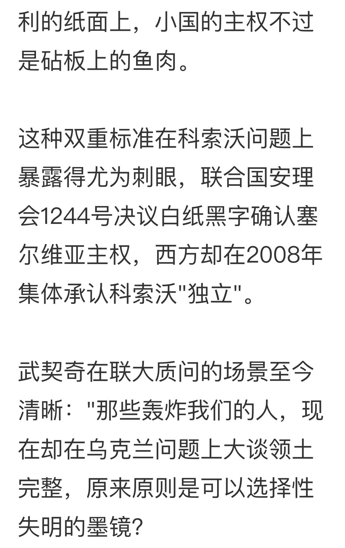 武契奇说了实话,联合国宪章成了废纸,联合国也是空架子,最近也听不到联合国开会了,白交会费,啥事都做不了。