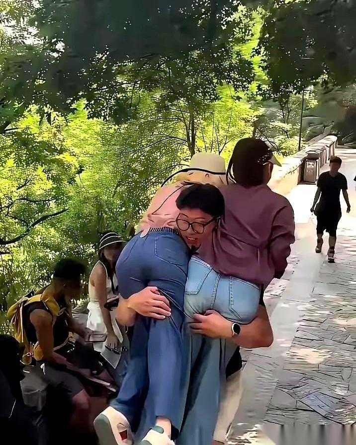 刷到个视频,直接给我看傻了。 一个男的,肩膀上一边一个,扛着他老婆和他小姨子。 在爬山。 就因为半山腰一句“走不动我背你们啊”的玩笑话。 小姨子也是真虎,当场就说“好啊”。 换你你怎么办? 尤其当着自己老婆的面,牛都吹出去了,下一秒就认怂? 不可能的。男人的胜负欲,有时候就这么莫名其妙。 于是,你就看到了那个又心酸又好笑又有点牛逼的画面。 一个中年男人,咬着牙,脸憋得通红,硬是把“一个承诺”变成了“两个包袱”,在山路上一步一步挪。 旁边拍视频的朋友都快笑疯了。 视频火了,评论区吵翻天。 一半人喊“姐夫威武”,说这腰是真金白银。 另一半人心疼,说“大哥快放下吧,腰椎间盘比面子重要”。 可我觉得吧,这事儿讨论体力、讨论腰,都格局小了。 这根本不是体力问题。 这是一个男人,在家庭里,用最笨拙的方式在说: “你们的玩笑,我都当真。” “你们的愿望,我都想办法实现。” 生活里那些“逞能”的瞬间,看着傻乎乎的。 但那背后,其实藏着最朴素的爱和担当。 那几十米路,扛的哪是两个人。 扛的是一个家的欢乐和底气。
