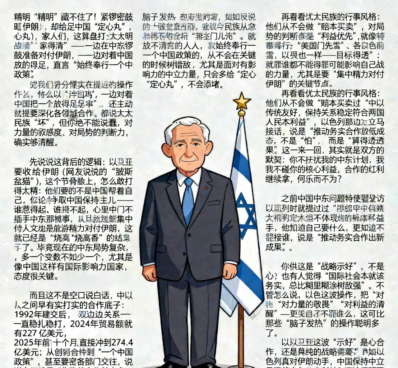 以色列示好中国背后与中东棋局精算 一边备战伊朗,一边高调重申一个中国政策,算盘打给谁看?以色列近期密集释放善意,还提深化合作。 1992年建交,2024年贸易额227亿美元,2025年前十个月升至274.4亿美元。创新、文化、旅游合作在。 以色列要的不是中国站队,而是中立。少一枚变数,它就能把火力对准伊朗。翟隽访以谈稳定关系与务实合作,以方称将密切部门往来,坚持一个中国。 判断更像战略示好,目的在稳住中国不搅局。建议中方维持克制,抓住对话与经贸收益,同时留足调停空间与底线。 接下来看以伊交锋。若冲突外溢,能源与航运风险上行。企业尽快做合规与供应链预案。外交继续劝和,防止局势失控。