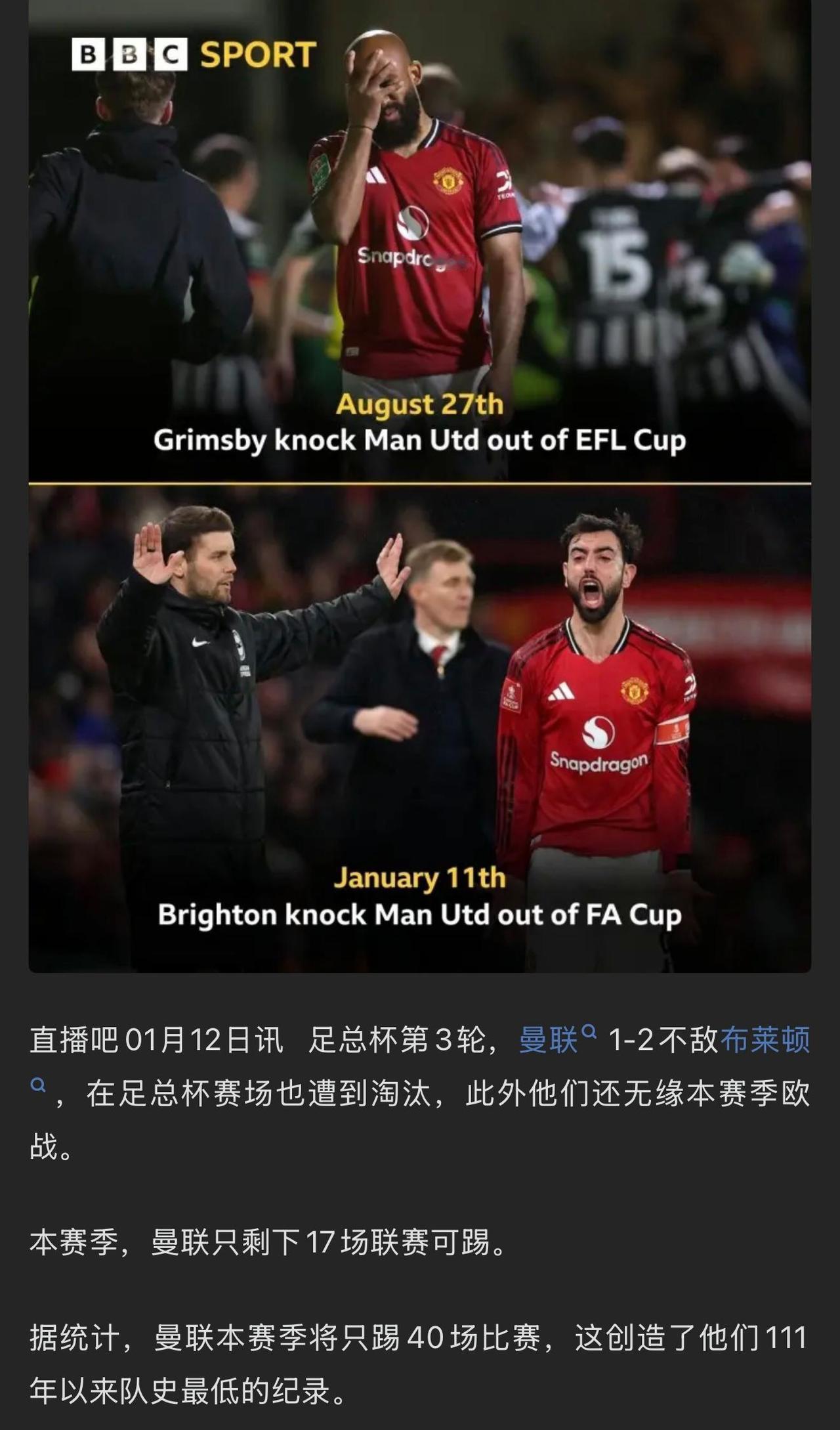 曼联又创造建队111年来最低记录。 一年只有40场比赛,没有欧战踢,足总杯,联赛杯早早被淘汰,只有英超比赛。 单线专注联赛,估计也很难前五名。 真的是太差了,曼联需要救世主。[可怜]
