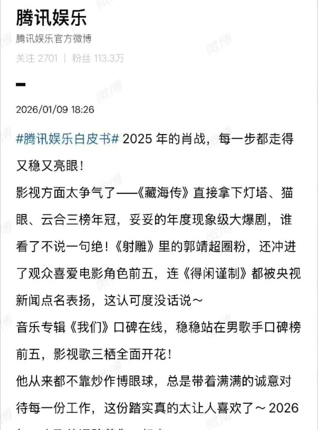 跨年夜烟花还没散,肖战工作室就甩出一条七分钟Vlog。 编舞老师提着行李,在锦州排练厅来回示范。 把唱跳拆成八拍,逐帧分解。 这一套流程,直接把“半吊子舞台靠修音剪辑”的质疑挡了回去。 七分钟背后,时间线拉回12月18日。 公开行程写着他,一边拍《藏海传》,一边跑跨年彩排。 两地相距快两千公里。 高铁转红眼航班,连轴转。 普通人吐槽一趟春运就想摆烂。 他却得在镜头前,把气息稳住。 这种硬碰硬的工作法,不算新鲜。 电影《诛仙》补戏,他自掏机票夜里飞横店。 电视剧《余生请多指教》收官,豆瓣评分稳在7.3。 单曲《光点》,QQ音乐数字销量破两亿。 这几组冷冰冰的数据说明一点。 市场愿意为可见的努力买单。 《腾讯白皮书》把他贴上“影视歌三栖全面开花”的标签。 听着像彩虹屁,但文档列出十余项作品、演出和公益时间轴。 粉丝顺手对照后,几乎都能核实。 评论区少见地没演变成大型对喷。 有人留言“这次先点个赞,作品出来再打分”。 接下来《射雕英雄传》等待播,密集档期也意味着雷点多。 观众要不要继续买票,就看他能否把这份踏实延续下去。 问题抛给屏幕前的你—— 如果下一个舞台仍是满格诚意,你会不会再次按下播放键?