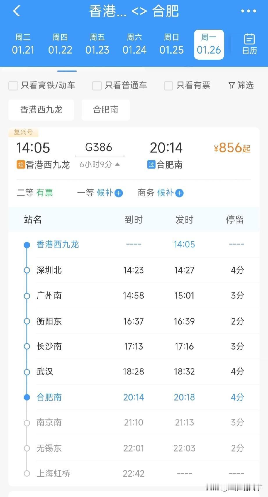 香港到合肥有直达高铁了,用时6小时9分,票价856元 以前香港到安徽,是没有直达高铁的,1月26号铁路调图,有了香港西九龙火车站直达合肥南站的G386次,车票已经开售。 中国铁路12306上显示,下午2点5分,香港西九龙站发车,经过深圳,广州,衡阳,长沙,武汉等站,在晚上8点14分到达合肥南站,二等座票价856元,总用时6小时9分钟。 这班G386次,是香港西九龙开往上海虹桥火车站的,到达合肥南站后,还会前行到南京南,无锡东,晚上10点42分到达上海虹桥火车站。 合肥到香港西九龙的高铁票,目前12306上还没有看到,后续应该会开通。坐动车去香港 深圳去香港交通 武汉-香港高铁 香港九龙西高铁