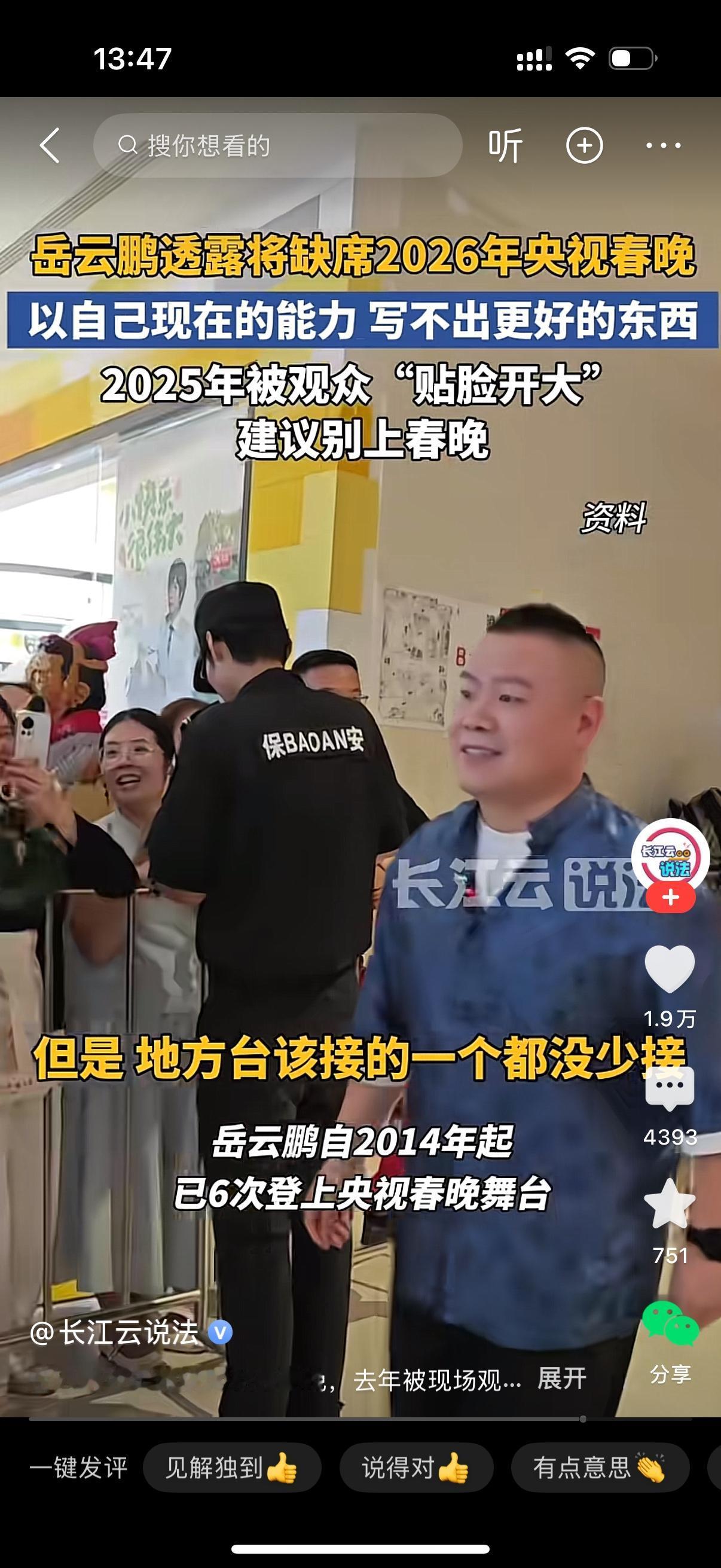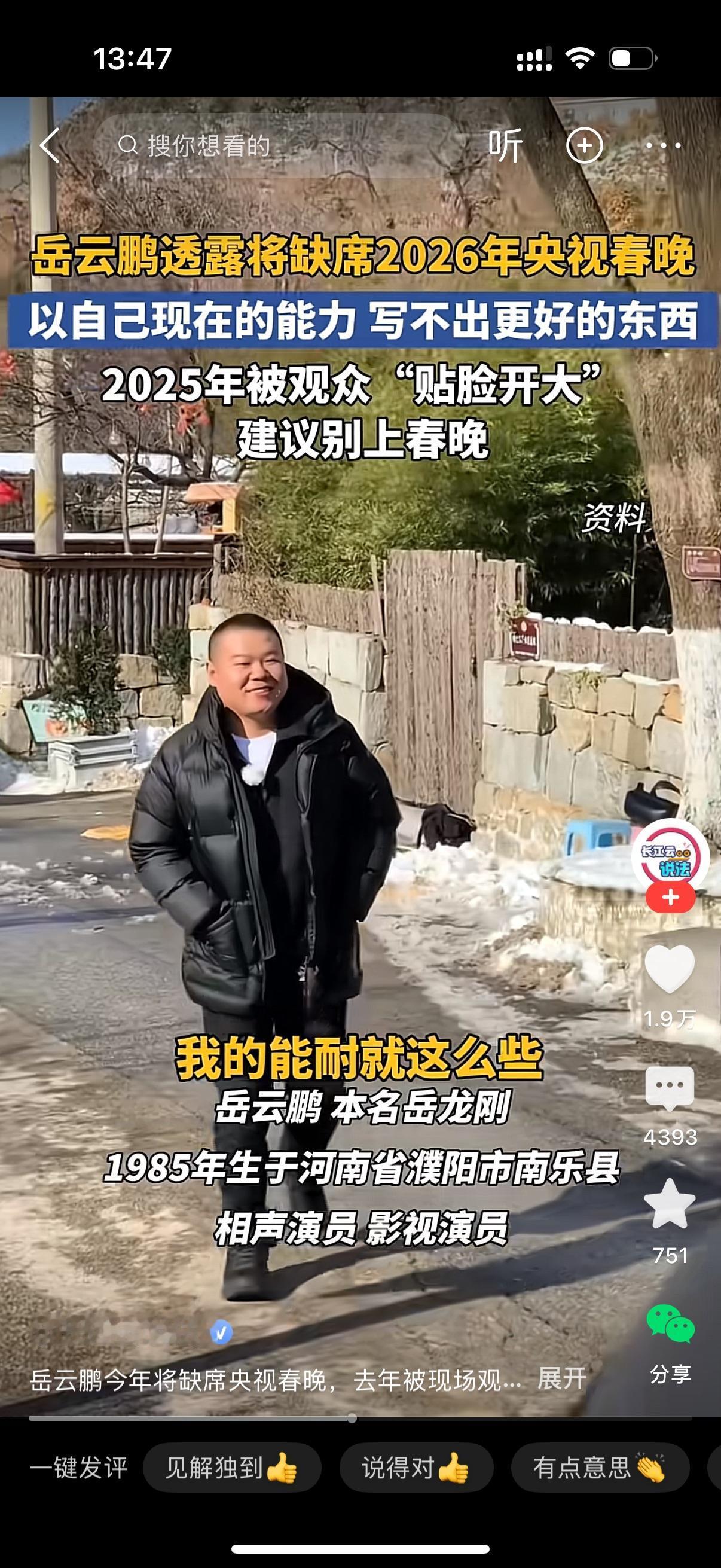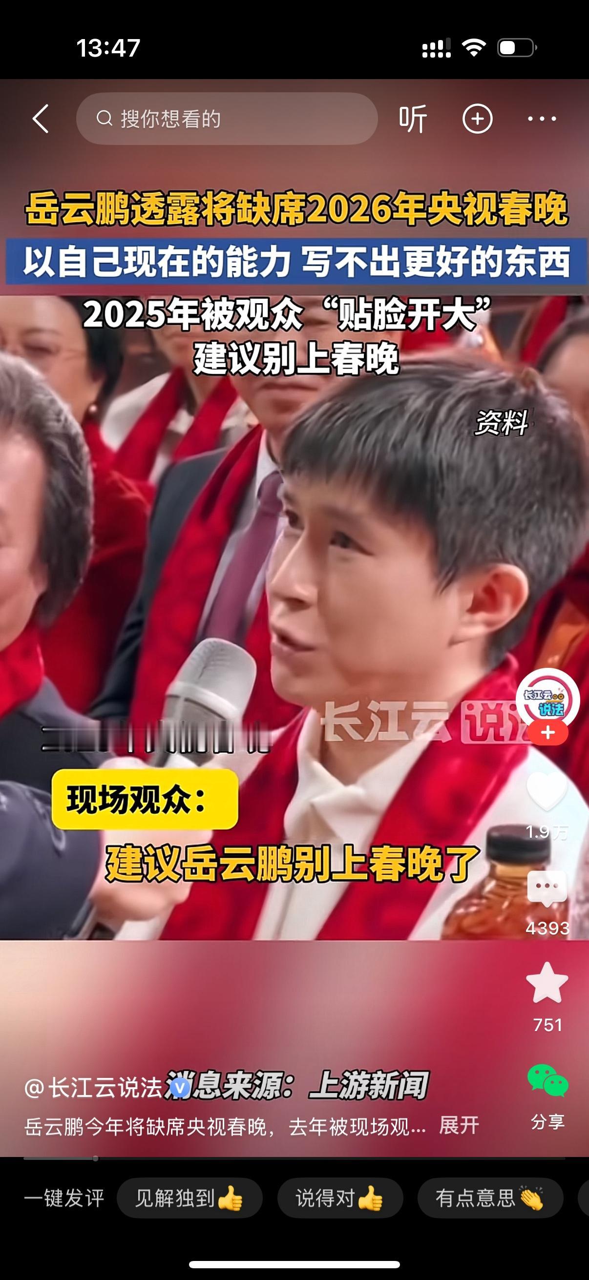 观众建议岳云鹏别上春晚了。岳云鹏也坦言自己的能耐就那么些,已经写不出更好的东西了。小岳岳说2026春晚肯定是不上了,但地方台的节目一个没少接。岳云鹏的相声从来没听过,他是一个相声演员吗?感觉一点存在感都没有,怎么红的?