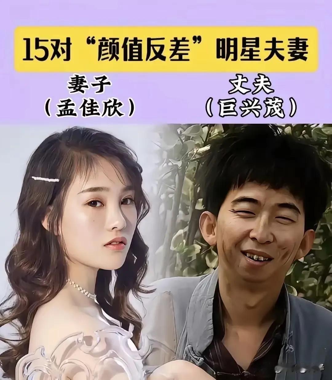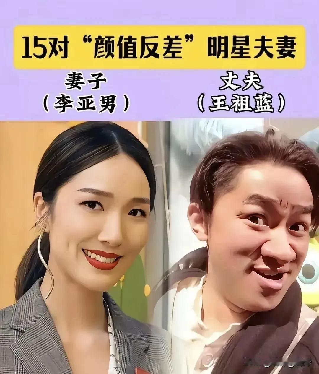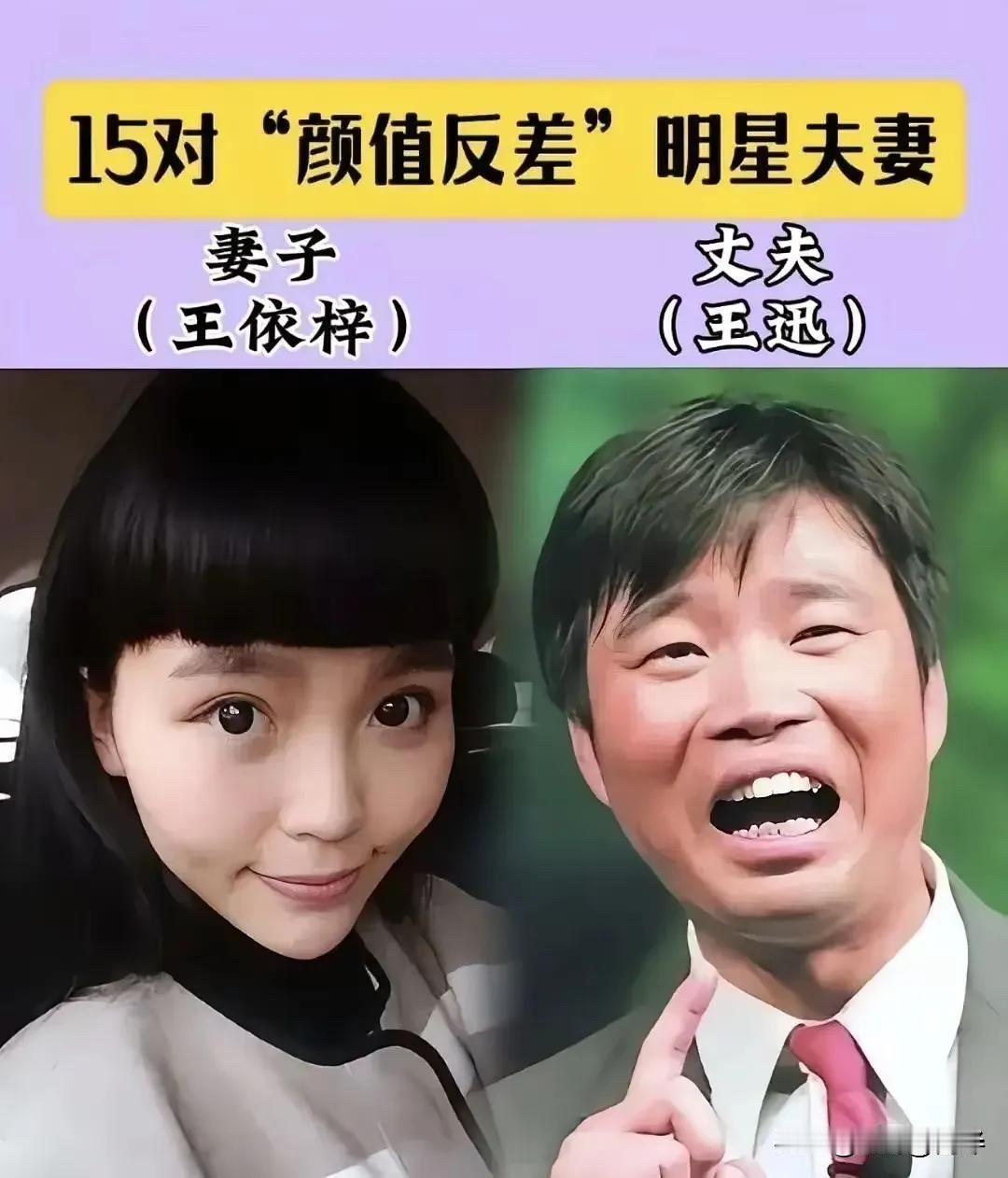 这“颜值反差”明星夫妻,日子过得好才是真本事 王依梓和王迅。王迅是大家熟悉的演员,《疯狂的石头》里的“四眼”秘书,《极限挑战》里的“大松鼠”,演技不错,综艺感也有。他之前有过一段婚姻,后来与小他很多岁的王依梓结婚。王依梓不是圈内人,比较低调。这对夫妻因为年龄和外形上的差距,偶尔会被议论。 孟佳欣和巨兴茂,导演、演员是巨兴茂。巨兴茂虽然其貌不扬,但非常有才华,是位优秀的导演和演员,执导和参演过《打狗棍》、《灵魂摆渡》系列、《娘道》等,实力派。他妻子孟佳欣据说是圈外人,也很少露面。巨兴茂能把戏拍得那么精彩,情感细腻,想必在生活中也是个有内涵、懂生活的人。 李亚男和王祖蓝。这对大家太熟了。李亚男是华裔小姐冠军,身材高挑,气质好。王祖蓝是香港多栖艺人,能唱能演能主持,个子不高,但才华和幽默感爆棚。他们当年恋爱结婚,就因为最萌身高差备受关注。但这么多年过去,你看他们上综艺,互动有爱,王祖蓝把李亚男当公主宠,李亚男也欣赏王祖蓝的才华和责任心。
