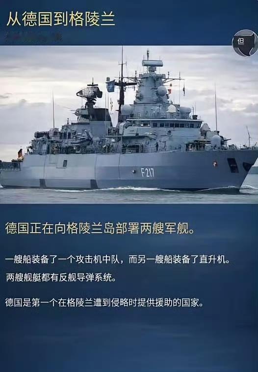 为了保护格陵兰,欧洲这是打算硬刚美国了?德国派出两艘军舰浩浩荡荡前往格陵兰,看样子是想向美国展示自己的实力。 两艘军舰分别配备了一个战斗机中队和一个直升机中队,实事求是地说,这点装备还不够美国人塞牙缝,想挡住美国大兵的脚步恐怕只是梦想。 德国的这两艘军舰更像是展示姿态,做表面文章,演戏给全世界特别是欧洲看。 为什么要演戏? 欧洲现在群龙无首,有两个国家一直想坐拥欧洲老大的宝座,一个是德国,另一个是法国,他俩都觉得自己够格,所以一直在明争暗斗。 当欧洲老大就要有老大的样子,法国这些年冲锋陷阵,跳得比谁都高,马克龙四处走访,就是想提高自己的影响力。 德国当然不愿意让法国风光无量,这次派出军舰事实上也是向欧洲伙伴展示老大的气魄。 不过,不管是法国还是德国,其实这种作秀一点用都没有,也只能起到自我安慰的作用。