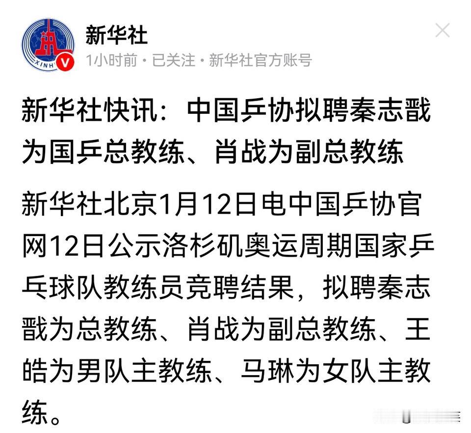 今天中国乒协官网公布了国家乒乓球队教练名单 总教练, 秦志戬 副总教练, 肖 战 男队主教练,王 皓 女队主教练,马 琳