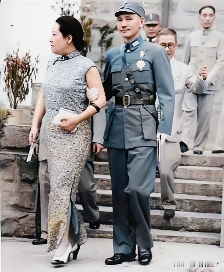 这是蒋中正挽着大姨子宋霭龄下石阶的一张老照片,拍摄于上世纪三十年代。这并非演员所扮演,确是货真价实的本人,外貌清晰可辨,一目了然。