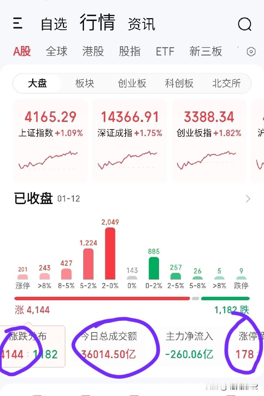 1月12日收评。3.6万亿的成交量,4000多家个股上涨,178家涨停(图2),