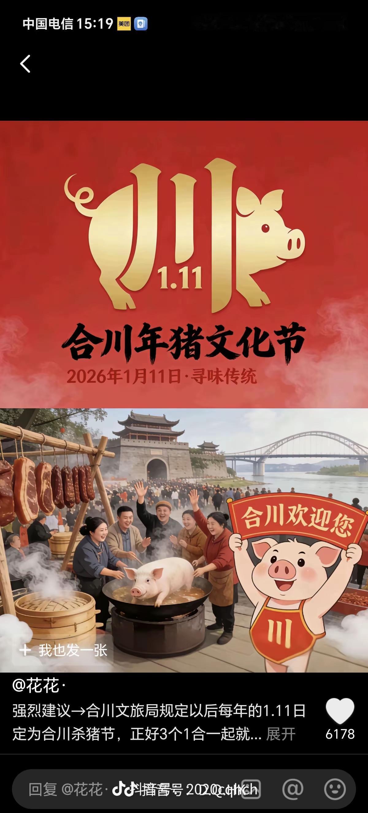 呆呆姑娘1月9日发贴,征集热心网友11月到她家杀年猪、吃刨猪汤(图一),当时她完全没想到她会成为2026年第一个“闯祸王”。好在呆呆姑娘并不呆,整个杀年猪活动充满了紧张、欢乐。我们记住了呆呆姑娘带给我们的欢乐,记住了2026年冬天的第一场烟火: 当预约人数超过1000的时候,呆呆姑娘第一时间到派出所备案,让官方知道有这么一件大事要发生。当地政府马上行动起来,合川文旅全面介入了后续的活动组织,一是积极在网上造势,让更多的网友知道合川云门街道庆福村的呆呆家要杀年猪,请大家吃刨猪汤。二是买猪、买菜、买碗、买筷,请做饭的师傅,布置场地等。11号现场杀年猪和吃流水席的事情基本都是合川文旅组织的,呆呆姑娘已经完全懵圈。三呢,肯定要蹭流量,宣传当地的文旅和特色产品,开卖钓鱼城门票、现场抽奖,送合川桃片等特色美食。 各路人马从重庆、南充、贵州奔赴庆福村,有单纯蹭流量开直播的,有东哥这种自己送一头大肥猪江湖救急的(东哥说本来预定300斤,结果郭表哥顺便抓了个242斤的),还有荣昌卤鹅哥送了几十只鹅雪中送炭的,更有在网络空间里面没有留下姓名但自带了很多好酒好菜的朋友,大家只想感受这场欢宴,感受这份喜庆。最终现场有超过4000人,网上还有超过十万人“云吃”刨猪汤。 1月11日杀了五头年猪,用东哥的话说“这五头猪实现了猪生圆满”。1月12日虽然不杀年猪了,但大家不愿离去,大家在现场开“村晚”,有乐队表演,有人唱歌,有人跳舞,人头攒动,欢声笑语响不停。警察叔叔还在现场维持秩序、通信公司的扩容车一直在现场为大家提供“流量”。大家提议今后就把1月11日设为“杀猪节”。此时此刻,庆福村的欢乐还在继续。