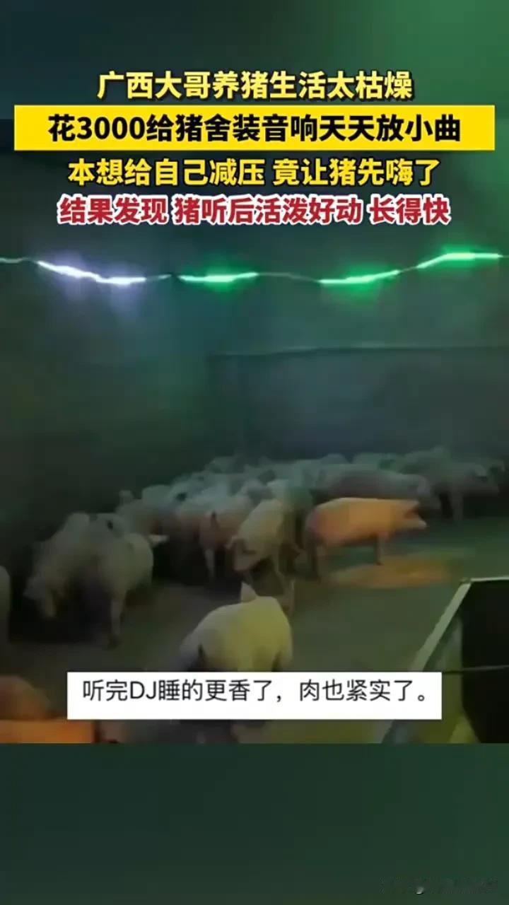 刷到个超搞笑的事儿!广西一位养猪大哥嫌养猪生活太枯燥,居然豪掷3000块给猪舍装了音响,天天搁那儿放小曲儿,本来是想给自己减减压,结果万万没想到,猪比他先嗨起来了! 猪舍直接变成了“猪界迪厅”,灯光晃悠着,音乐放着,猪们听得活泼好动,连长势都变好了,一个个跟蹦迪选手似的,网友都调侃“KTV都开到猪圈了”“VIP8号台的猪还得要份加热细糠”。更逗的是,要是放了些节奏太冲的歌,猪还会吓得慌慌张张跑开,主打一个情绪随旋律切换。 现在看来,大哥这波操作属实意外解锁了“音乐养猪法”,猪的娱乐需求算是被狠狠满足了,估计这批猪的肉都得更紧实,毕竟蹦迪消耗大啊!养猪音乐 不正经的养猪人 养猪搞笑日常