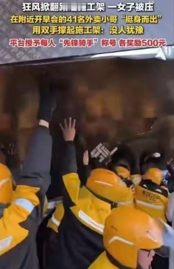 1月10日河南郑州,路边施工架被大风吹翻压住一名过路女子,千钧一发之际41名外卖小哥迅速集结,合力撑起倾斜架子成功救出被困者。平日里风里来雨里去的外卖骑手,危急时刻化身救人英雄,事后外卖平台授予他们“先锋骑手”称号,并为每人发放500元现金奖励,凡人微光汇聚成炬,他们的善良与勇敢值得点赞。