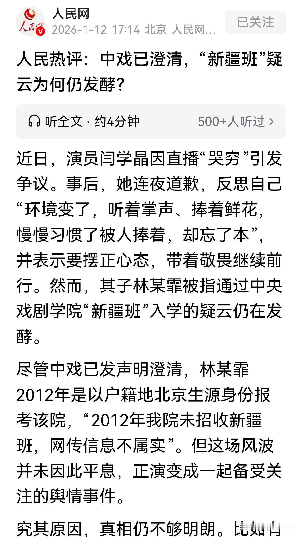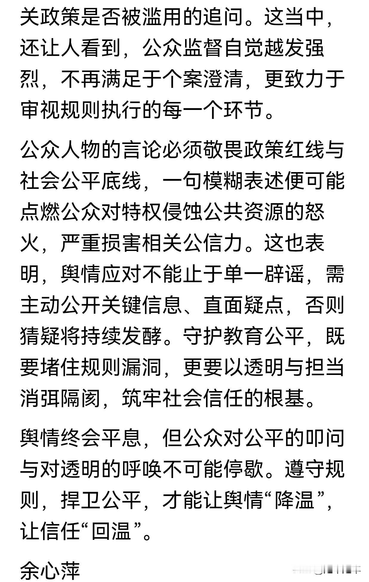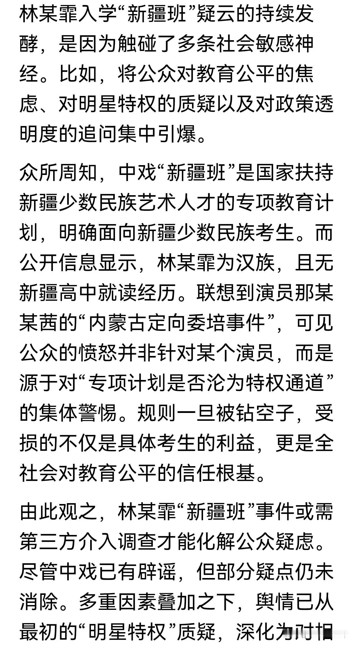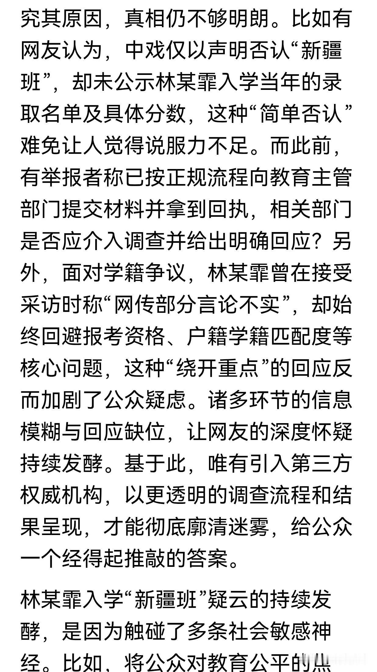 人民网热评:中戏已澄清,"新疆班"疑云为何仍发酵?!! 我总结一下该文的三个核心问题就是,一是中戏的声明不够透明,没有公布录取名单和分数,导致说服力不足。二是举报者已向教育部门提交材料,但相关部门未回应。三是林某霏本人回应回避核心问题,比如户籍学籍匹配度。 目前对于这个事件任需要第三方介入调查,才能增强透明度。中戏主动公开信息,才能化解疑虑。同时中戏面对舆情应对,不能仅靠辟谣。必须直面群众们疑点,堵住规则漏洞,才能维护公平信任。这个事件的舆情从“明星特权”质疑升级为对政策滥用的追问,反映出群众对教育公平性的零容忍。公众人物及相关机构必须敬畏政策红线与社会公平底线。 网民们的疑云持续发酵原因就在于信息不对称、中戏回应不充分,触动了群众对教育公平的敏感神经。唯有通过全面信息披露,才能根本化解疑虑,捍卫教育公平与社会信任。