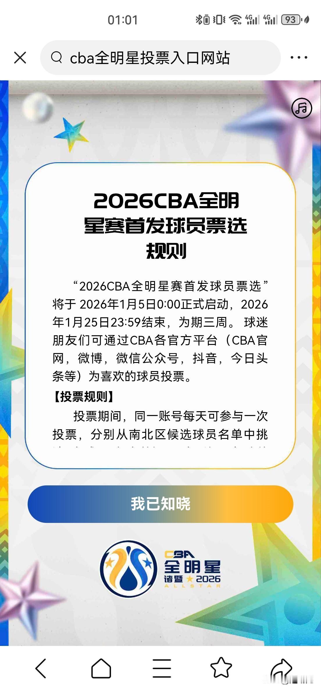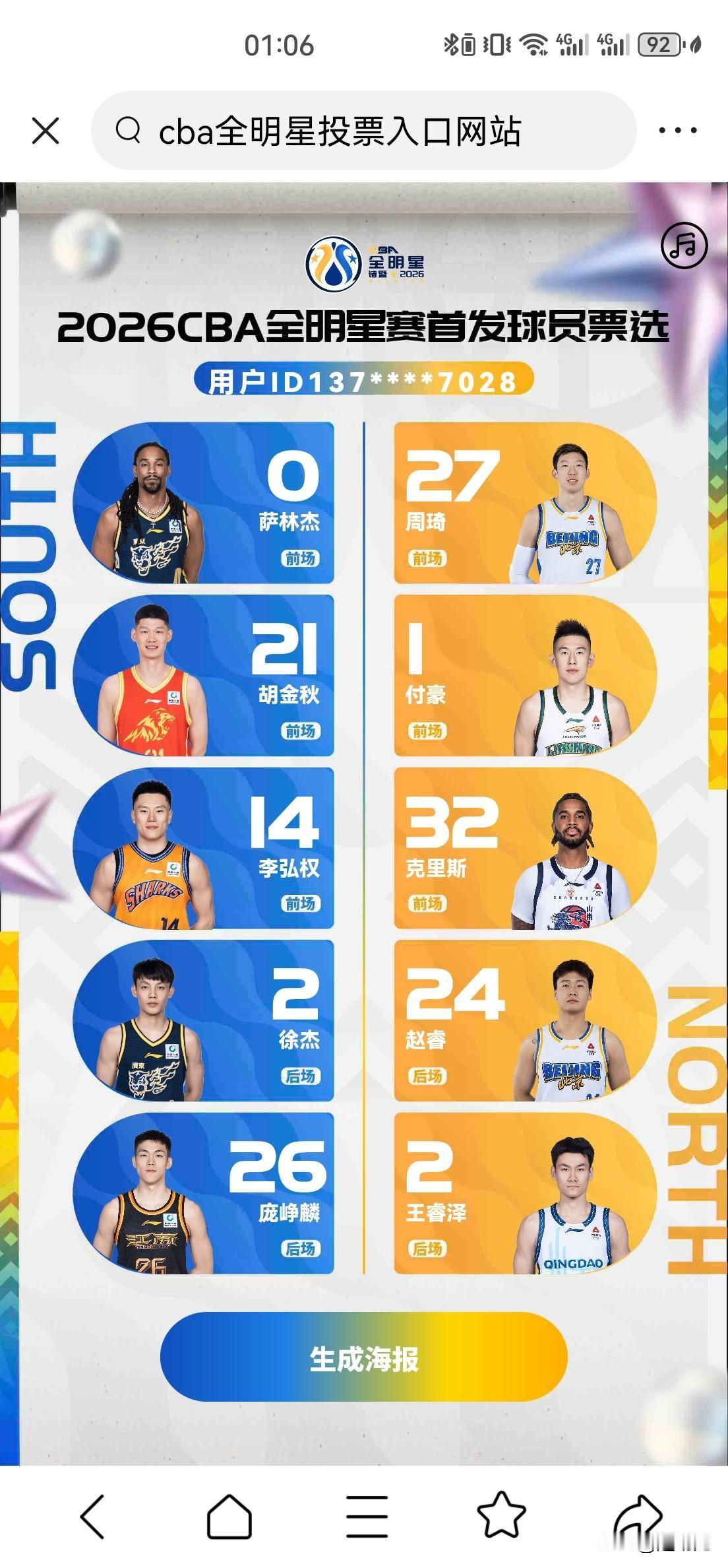 CBA全明星周末第一投票结果公布: 徐杰405011票领跑南北区票王, 赵睿320263票领跑北区。 广西跑车庞峥麟以172175票,力压状态低迷的胡明轩进入南区首发阵容。 CBA全明星投票官网入口(2025-2026赛季):。 - CBA联赛官网首页入口 - CBA官方APP、官方微信公众号/小程序、视频号、微博、抖音、今日头条、快手、虎扑CBA官方账号等平台入口
