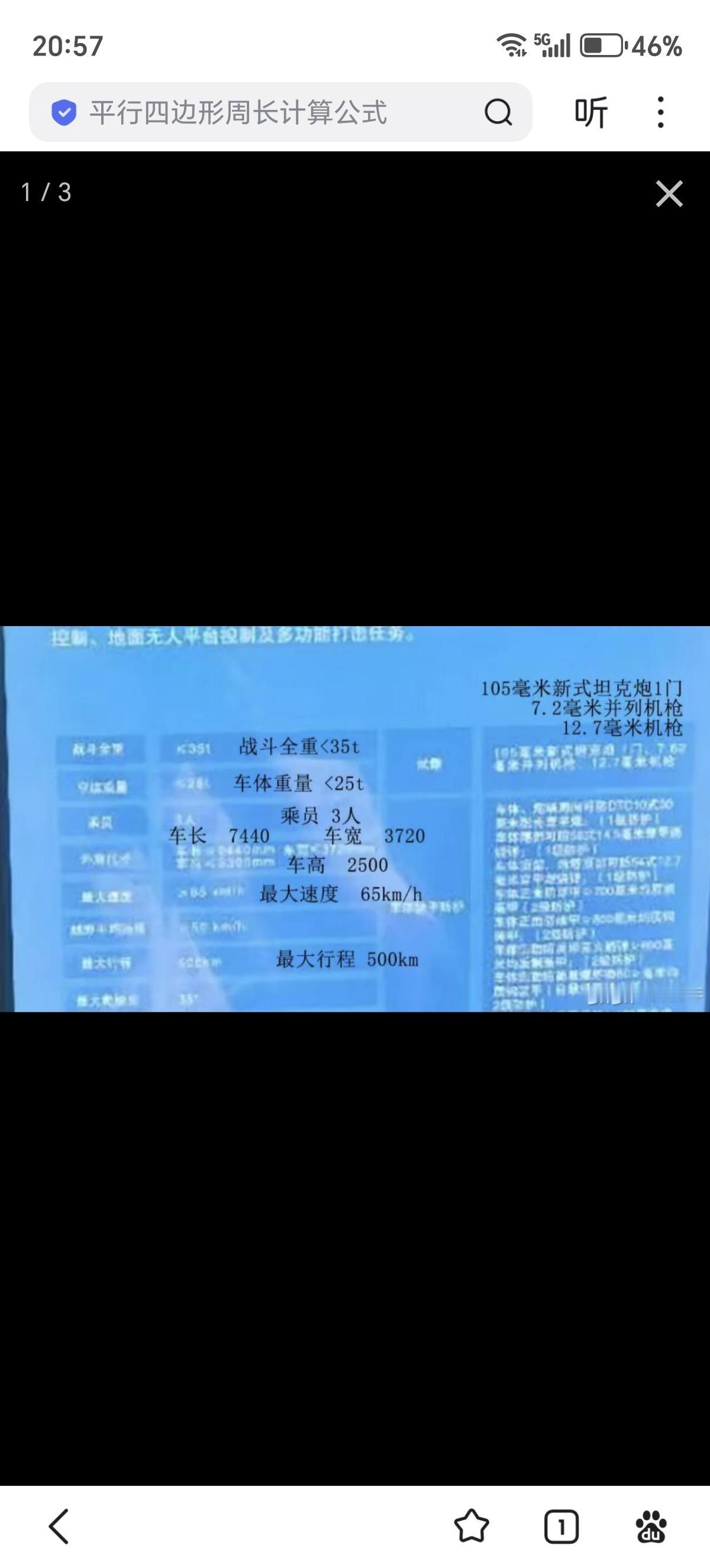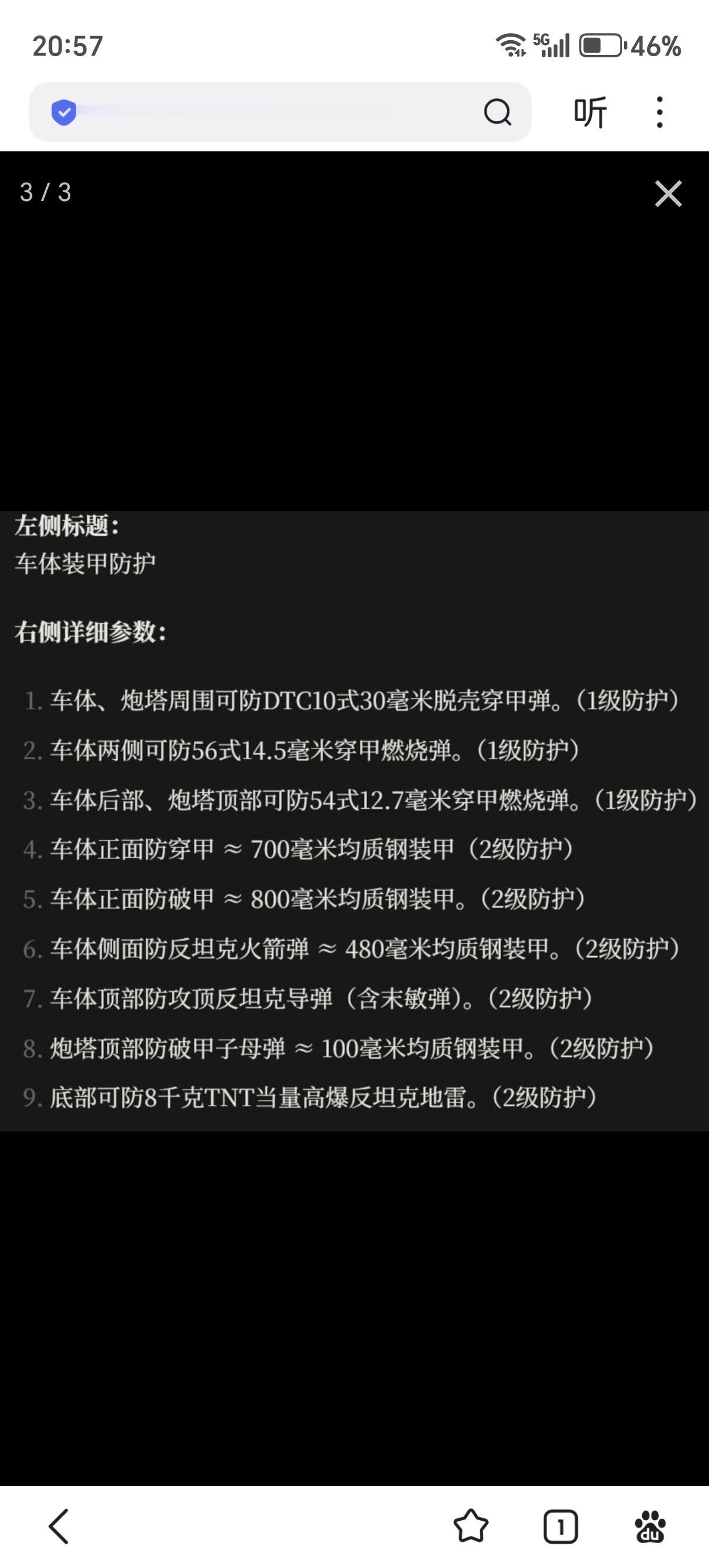 疑似100式四代坦克的性能数据出来了 战斗全重35吨,裸车25吨,最大速度85km/h,越野平均速度50km/h,最大行程500km 防护等级: 第一句:车体、炮塔周向可防DTC10式30毫米脱壳穿甲弹。(1级防护) 第二句:车体两侧可防56式14.5毫米穿甲燃烧弹(1级防护) 第四句:车体正面防穿甲>700毫米均质钢装甲(2级防护) 第五句:车体正面防破甲>800毫米均质钢装甲(2级防护) 第六句:车体侧面防反坦克火箭弹>480毫米均质钢装甲(2级防护) 整体防护水平>52吨的VT4,这就是甲弹对抗仙人--35吨级四代坦克的防护水平(四期105穿深>三期125)