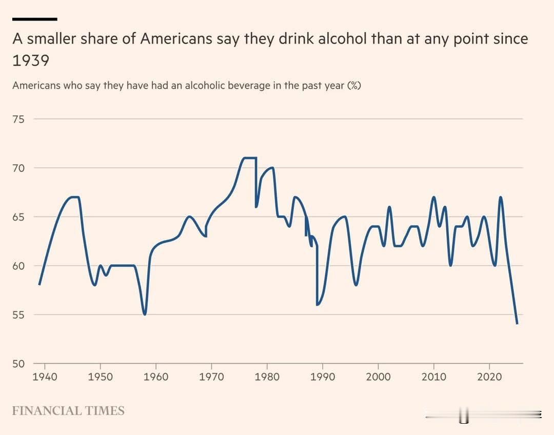 过去一年,美国仅有一半人口饮用过酒类饮品,这一比例已跌至1939年以来的最低水平