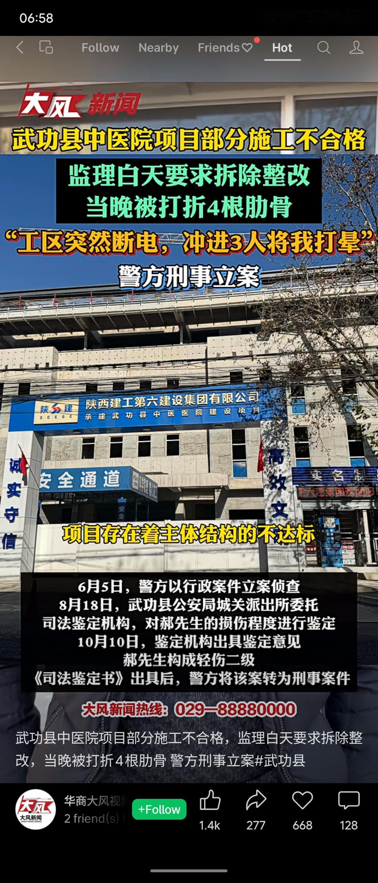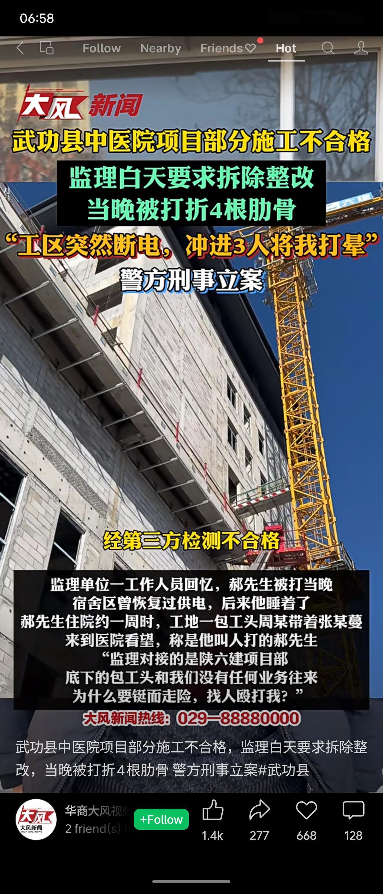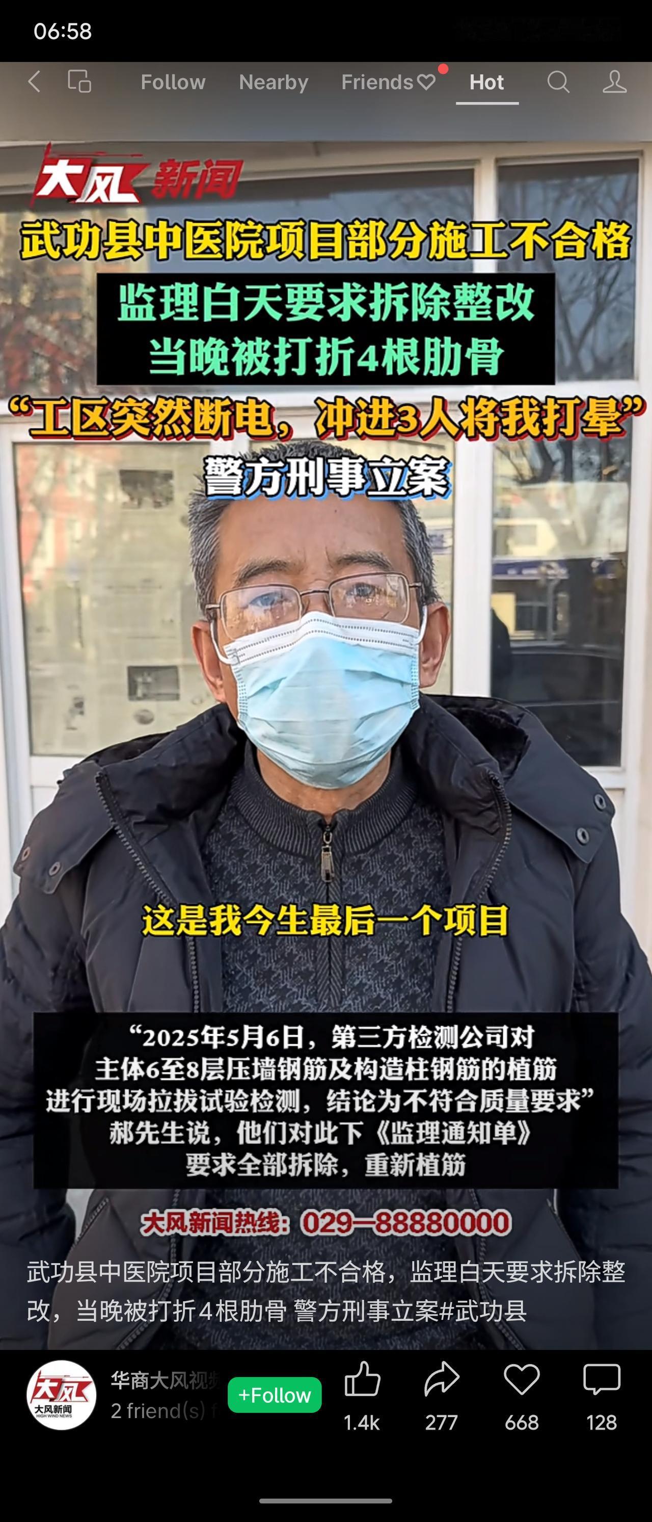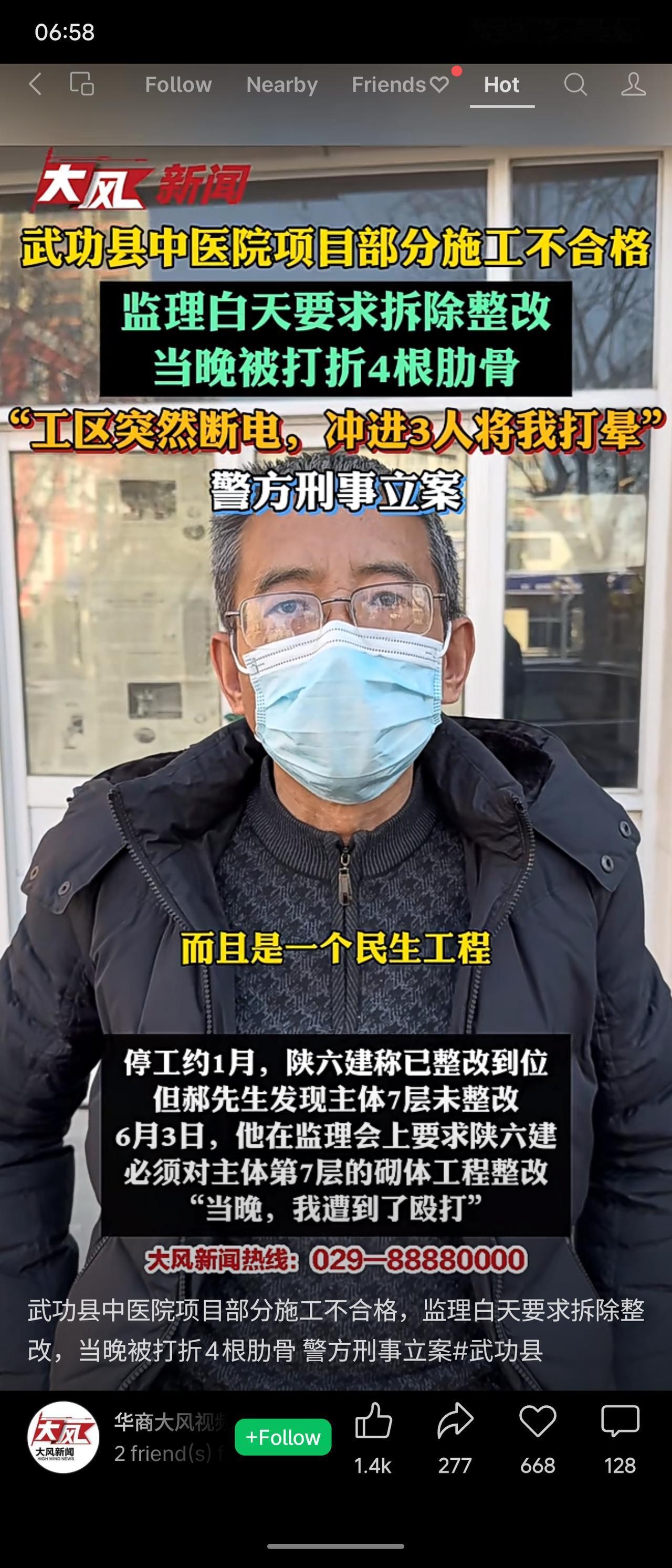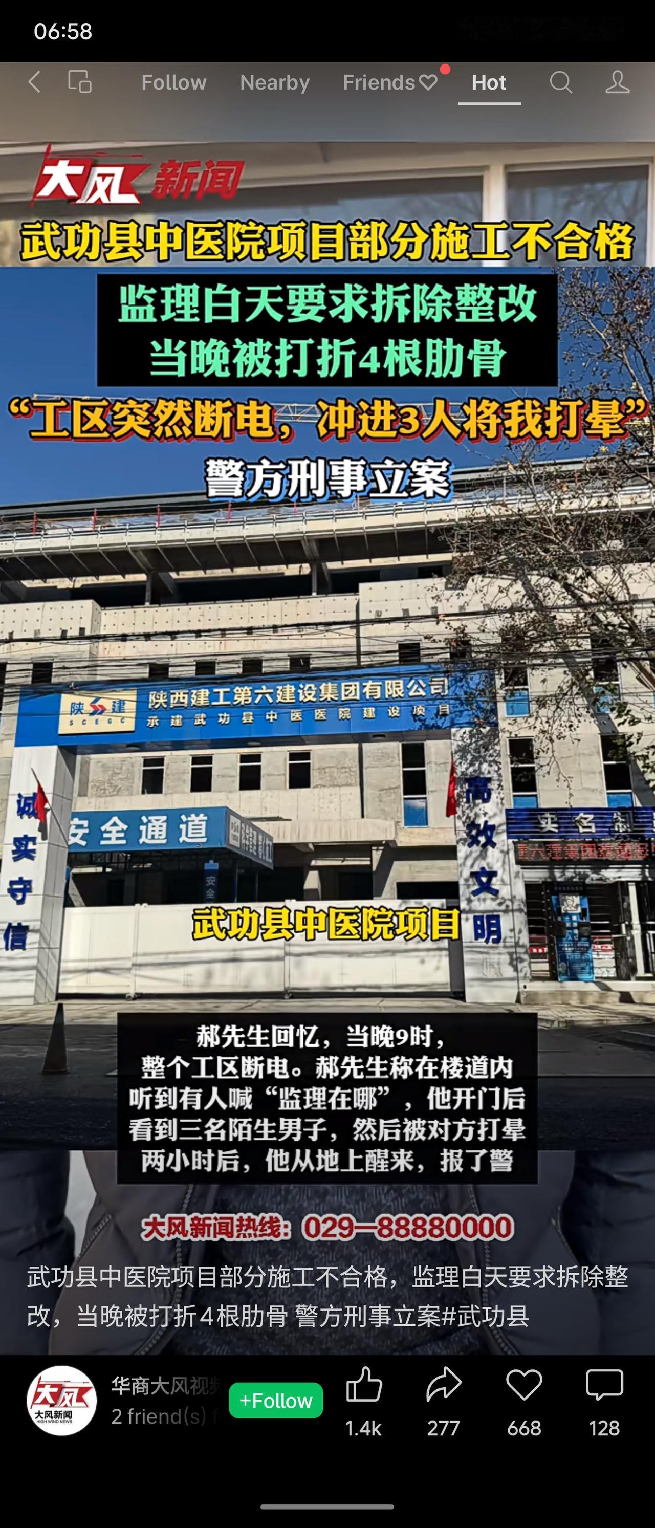 陕西武功县中医院项目施工质量不合格,监理郝先生(59岁)要求拆除整改后,当晚在工地宿舍遭三人闯入殴打,致4根肋骨骨折,鉴定为轻伤二级。警方已刑事立案。承建方为陕西建工第六建设集团,有包工头承认指使打人。事件暴露民生工程监管困境与暴力阻挠整改的恶劣行径。