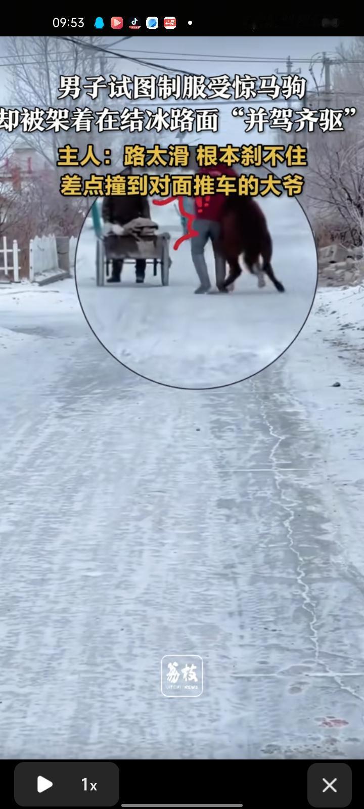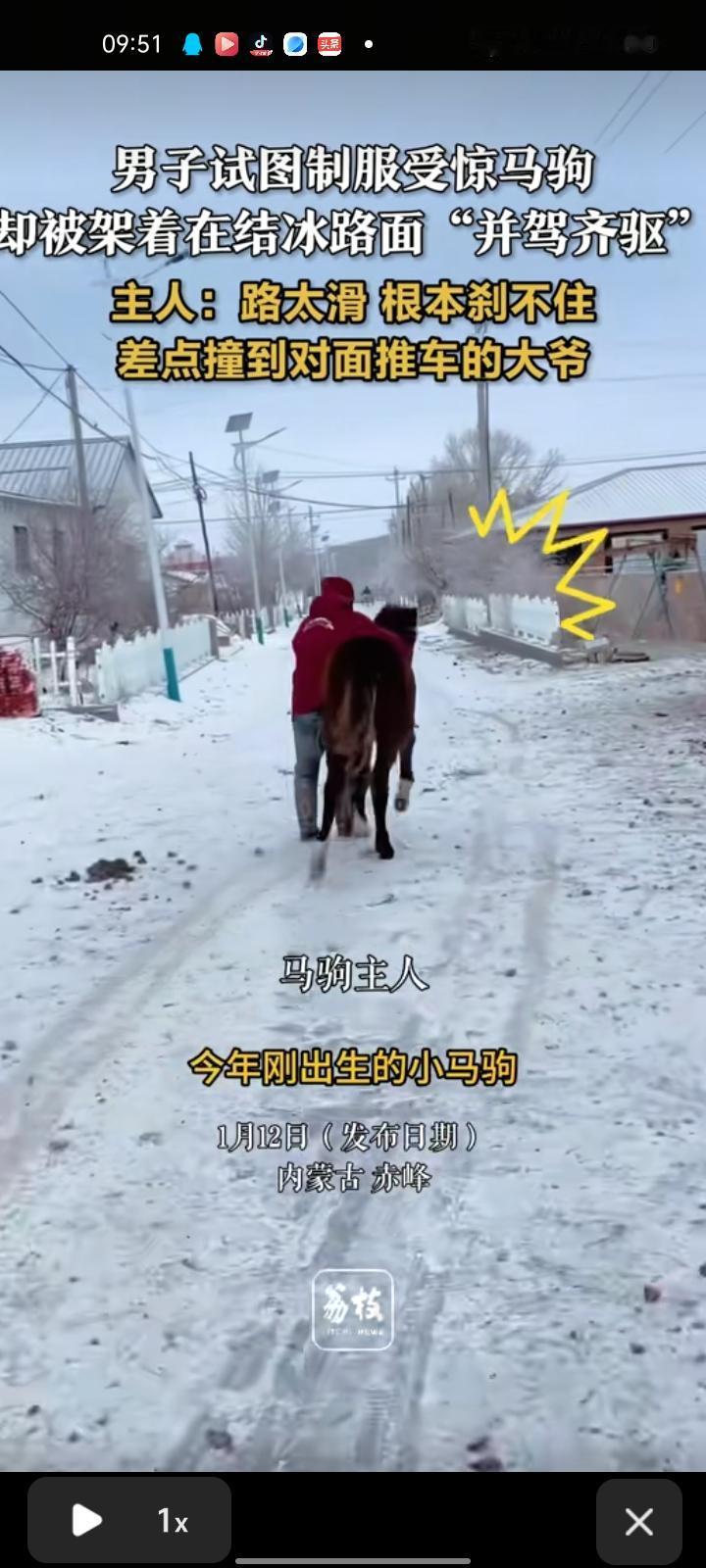 1月5日,赤峰市克什克腾旗。男子牵着马驹去喝水,喝完水后它有点害怕就开始跑,他试图制服马驹却被架着结冰路面“并驾齐驱”,路太滑根本刹不住,差点撞到对面推车的大爷