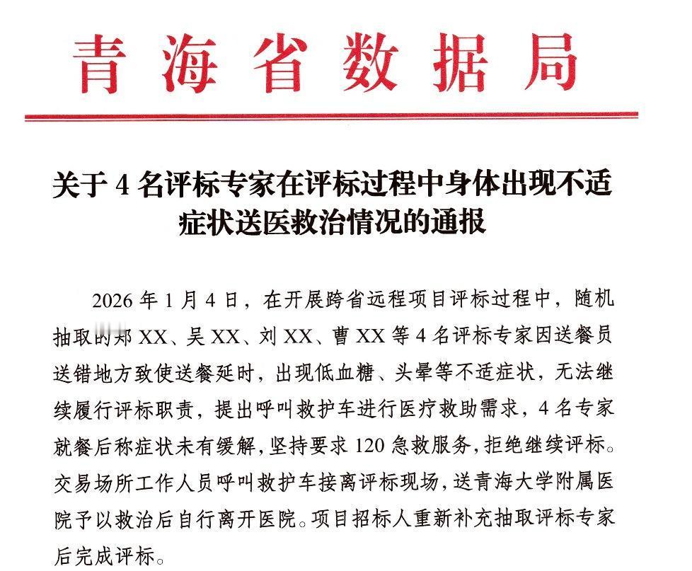 4名评标专家因送餐延误拒评标被解聘! 青海这起评标风波争议很大!4名评标专家因送餐员送错地方耽误吃饭,低血糖头晕后,就餐了还坚持叫120,直接拒绝继续评标,最终被解聘出库,这事看完真的让人五味杂陈。 1月4日跨省远程评标现场,就因为送餐延时,4名专家集体出现不适,提出要急救。工作人员赶紧安排就餐,可专家们说症状没缓解,铁了心要叫救护车,死活不继续干活。最后被120拉去医院,结果又自行离院了,项目只能重新抽专家才完成评标。 官方通报说得很明白,评标工作强度大,经常加班熬夜,对身体要求本就高,规定入库专家必须身体健康、能正常履职。这4人没法坚守岗位,解聘出库完全合规,还特意感谢了他们过往的贡献,也算留了体面。 这事一出网友都吵翻了,有人理解低血糖确实难受,头晕眼花根本没法专注评标;但更多人觉得离谱,评标是多大的责任,就因为一顿饭延误,说撂挑子就撂挑子,未免太不负责。而且就餐后还不复工,送医又自行离开,实在说不过去啊。 说到底,评标专家手握的是公共资源配置的话语权,不仅要专业过硬,责任心和抗压能力也得跟上。身体不好本就不该入库,既然来了就得扛起责任,不能一点突发情况就退缩。 也给各地提了醒,后勤保障得跟上,专家健康管理也得严,既要保障专家身体,更要守住评标工作的严肃性,这样才能让招标项目公平推进!