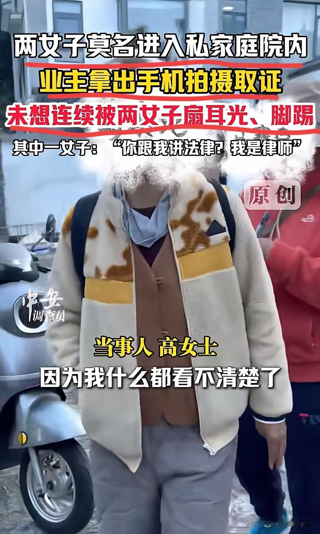 大理这事儿看着真让人上火,俩女的大摇大摆闯进别人家院子,被主人发现了拿手机拍视频留证,结果这俩人不道歉反而急眼了。 上去就是扇耳光加脚踢,嘴里还嚷嚷:“你跟我讲法律?我就是律师!” 这就有点意思了,既然自称律师,难道不懂私闯民宅是啥罪名?知法犯法还敢动手打人,这职业素养是体育老师教的吧? 说实话,这要在国外,私闯领地可能直接就“吃花生米”了,哪还有机会在这耍横。 现在警方已经介入了,我就好奇这“律师”证到底是真的还是拿来吓唬人的。平日里估计也是豪横惯了,这回踢到铁板上,看她怎么收场。 这种人就得让法律好好教教她怎么做人,别以为披个律师皮就能无法无天。