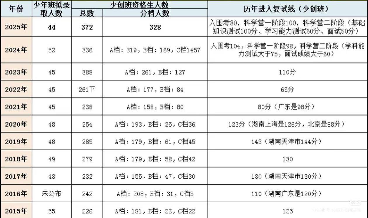 中科大少创班录取人数十年趋势:从“小众试点”到“20%生源库”的扩张与波动 2025年少创班录取结果372人, 其中A档生占比高达88%(328人), 科学营二阶段测试需同时满足 "基础分100+能力分60+面试50"的"三高门槛", 比2024年的"学科能力75+面试60"难度飙升30%。 2022年教育部扩大“基础学科拔尖计划”, 中科大获专项招生名额, 少创班从“试点项目”升级为“主力招生渠道”; 取消“中学推荐制”改为“自主报名”, 2023年起少班报名人数突破1.2万人。 值得注意的是少年班学院生源优质, 90%获档考生有竞赛奖项, 信息学、数学竞赛生占比超60%, 形成“竞赛强则录取稳”的格局。 2025年少创班招生人数首次回落, 录取人数328人较2023年下降12%, 竞争烈度反升, 原因在于少创班取消“竞赛省一加10分”规则, 金银牌考生审核趋严, 导致部分竞赛生转向清华新领军、 北大数学英才班。 科学营二试晋级人数从2024年1200人 降至2025年近千人, 录取率从11.8%降至9.2%; 中西部省份录取占比从17%提升至23%, 传统强省(如浙江)录取名额被稀释, 2024年浙江录取人数曾创历史新低。