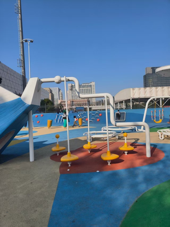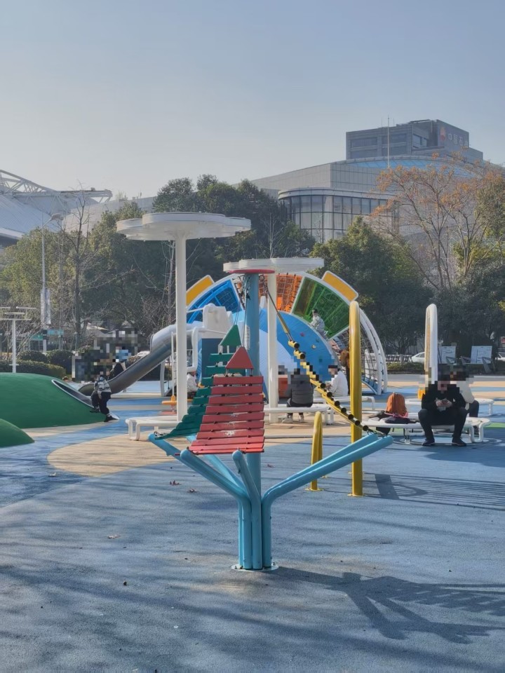 遛娃的第一站,也是本次citywalk的起点,选在了亲子友好度拉满的黄龙体育中心游乐场。这里不像商业游乐场那么拥挤,是露天开放的,更像是周边居民私藏的遛娃宝地,关键是免费开放,性价比直接拉满。