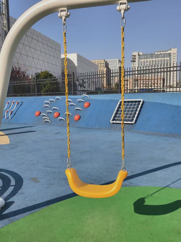 乐园紧邻室外田径场,场地开阔通透,阳光透过茂密的绿植洒下来,温暖又不刺眼。玩乐设施不算多,但每一样都是孩子的心头好,蜿蜒的滑梯、可尽情攀爬的外圈、堆满细软沙子的沙坑,还有转起来就停不下来的转转乐、转椅、转柱,以及能敲出清脆声响的敲击乐器区。
