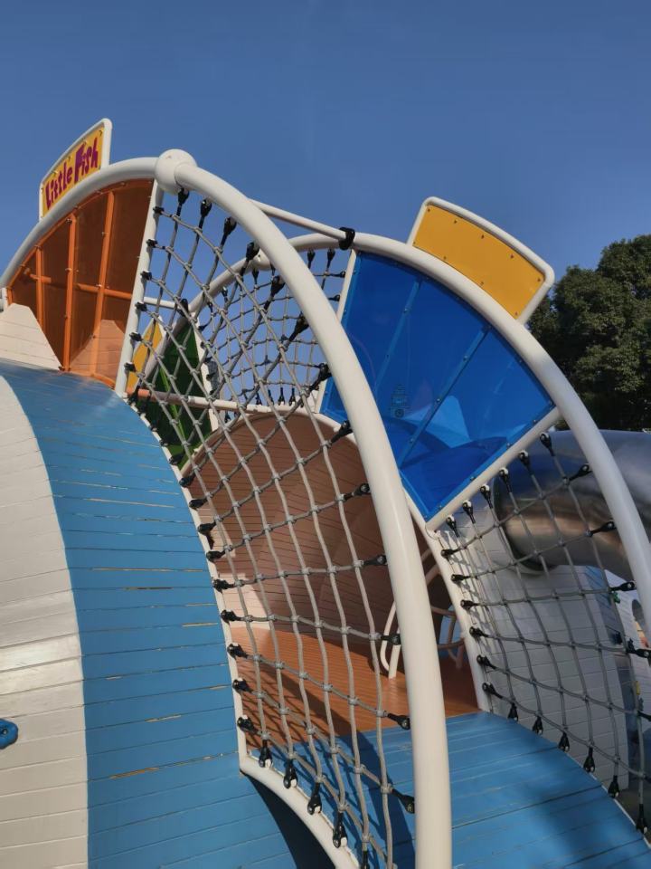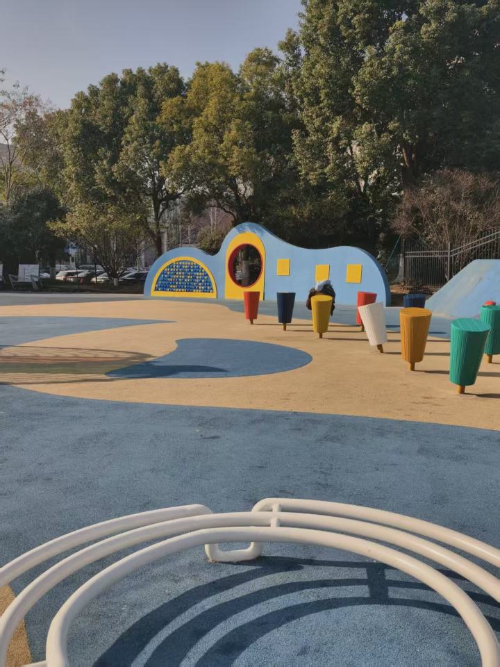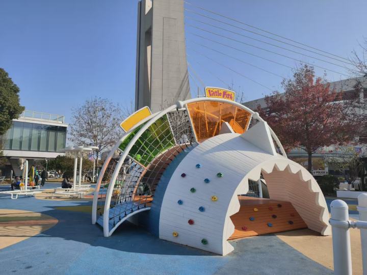 乐园的颜值很高,蓝白色的鱼形主体建筑自带清新滤镜,攀爬区前的彩色墩子更是出片神器。天气晴好时,给娃穿上亮色衣服,随手一拍就是充满童趣的多巴胺大片,家长也能顺便蹭拍几组氛围感照片,遛娃拍照两不误。