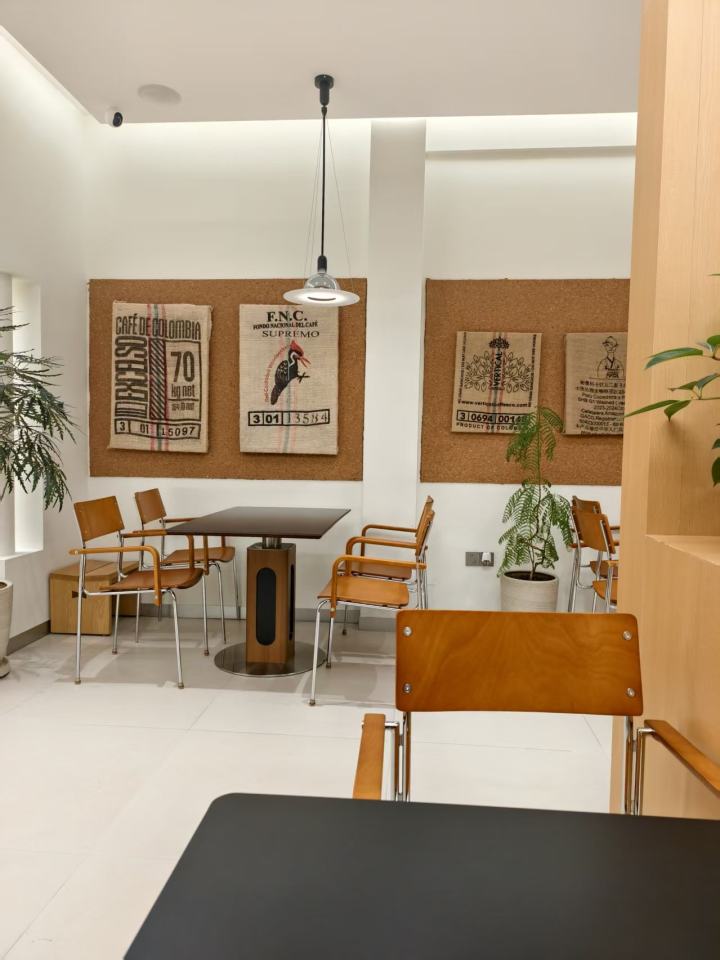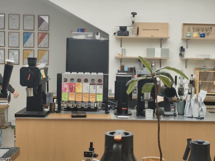 店里光是咖啡机就很有讲究,蓝标LaMarzoccoStradaX与ASTORIA赛事机双机坐镇,专业感拉满。每一款咖啡豆都配有专属小卡片,详细标注出产地与口感特点,咖啡师还会耐心讲解,就算是咖啡小白也能轻松get到不同豆子的魅力。