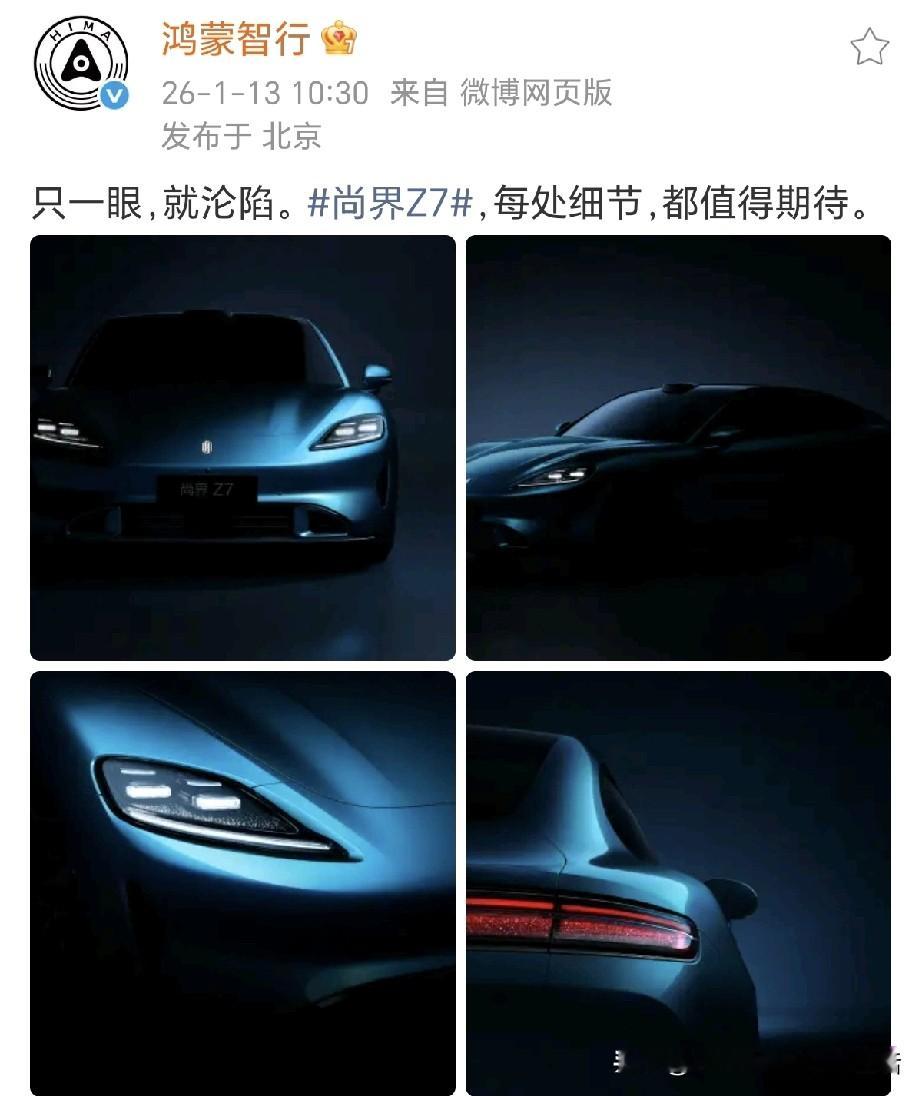 再次强调一下,我有强烈的预感,今年是上汽尚界爆发的一年,单单这个尚界Z7的颜值,就一眼沦陷! 就在刚刚鸿蒙智行官宣,比新一代,更期待的尚界Z7,官方曝光了Z7的宣传图片,这颜值太漂亮,有眼尖的网友发现尚界Z7用的是尊界同款星河大灯!深海蓝车身在暗调光影里勾勒出轿跑的凌厉线条,大灯锐利如刃,尾灯带着“星云画卷”的细腻质感,运动感拉满。 发光logo,星河大灯,星云尾灯,细节全是惊喜,比新一代更值得等待!Z得7待啊!有不少网友表示问界还没开上,尚界Z7又出来了!消费者在欢呼,友商们却在“瑟瑟发抖”!你们觉得呢? 全球第六代荣放中国交付备受关注