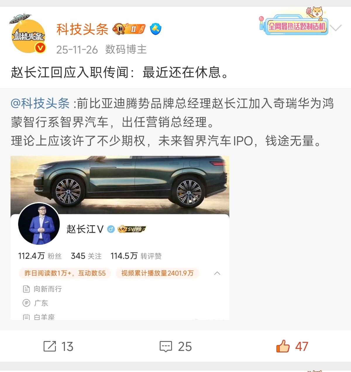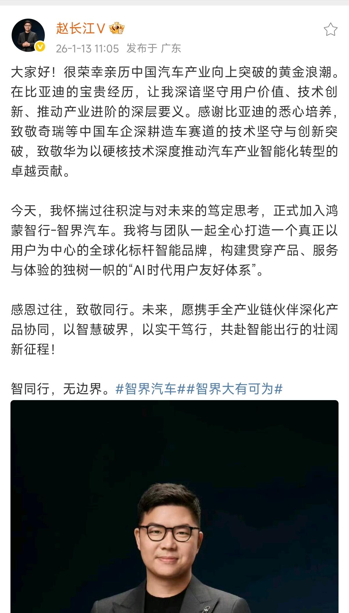 时隔一个多月,前比亚迪腾势汽车总经理赵长江官宣加入华为&奇瑞的智界汽车,出任智界汽车执行董事及执行副总裁,据说会负责品牌营销等工作。【来自懂车帝车友圈】