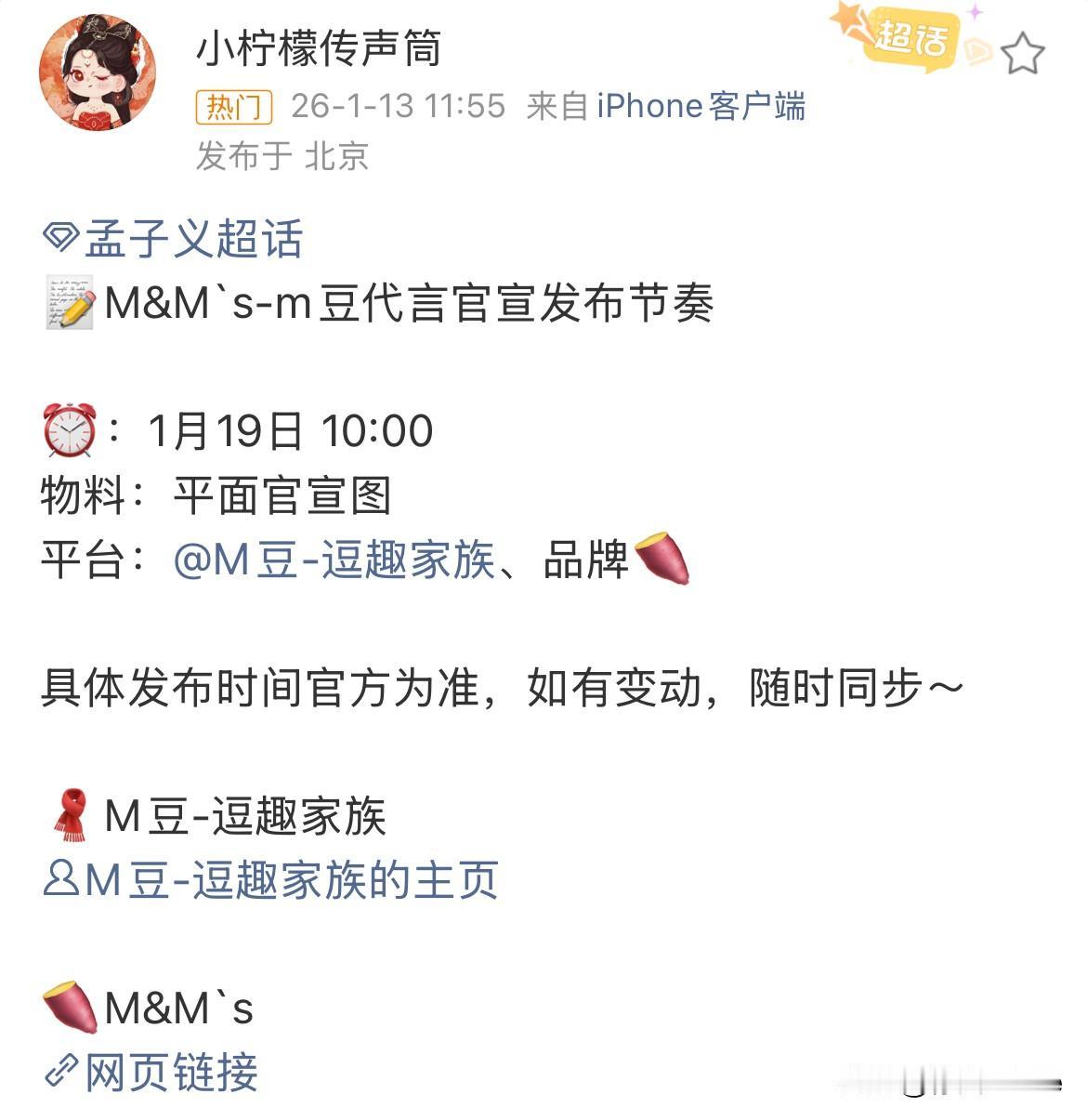 1月13日,孟子义官宣新代言MM豆! 谁能想到去年孟子义在综艺里饭后闲聊互动的一句话,会成为今年的开年新代言 在hi6衍生综艺里,孟子义跟大家一起用晚餐,听到吴泽林说吃饱喝了时,孟子义主动递上MM豆,李雪琴诧异询问,这是你商务啊? 孟子义摇头表示不是,只是自己单纯喜欢时,随后提到MM豆,就是孟孟豆,何炅听完举杯跟孟子义捧杯,面对何炅的夸赞孟子义跟MM很像,众人纷纷说孟子义要接新商务了,孟子义自己也说它们要找她,一年过去了,谁也没当回事,没想这事就成真了! 以后MM豆有小名了,叫孟孟豆~