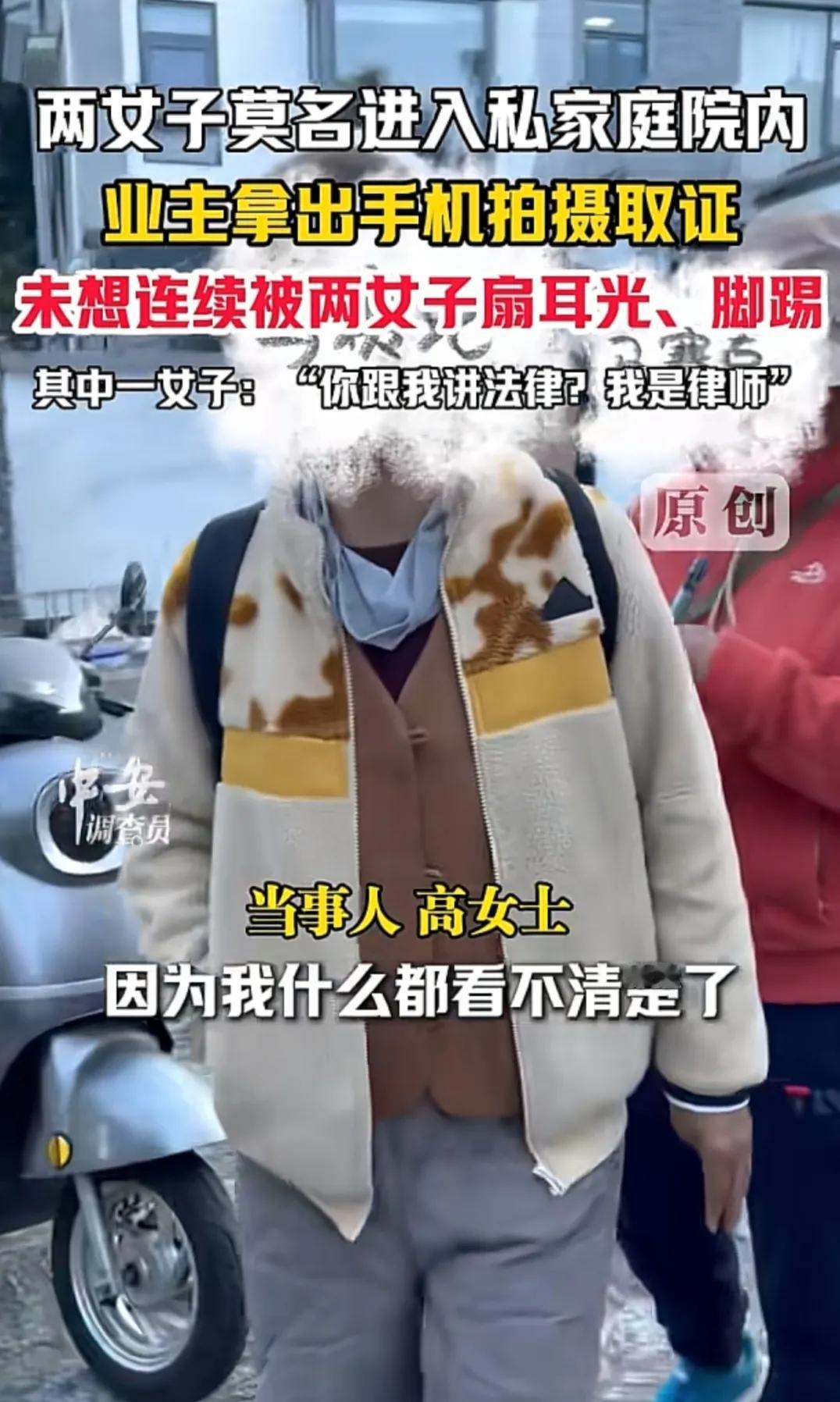 大理。 两名女子走进一户私宅,业主不知两人要干嘛,就用手机拍摄视频。两名女子对业主拳打脚踢,叫嚣:“你跟我讲法律?我就是律师”。警方介入调查。 这两位女士,既然你们是律师,肯定熟悉法律条款,你们这是私闯民宅,懂?会怎么判罚? 如果在漂亮国,你们这种行为,主人是可以请你吃花生米的。 我国虽然没有私闯民宅的说法,也不是说你想去哪就去哪,如果真觉得人家好看,可以征得主人同意,还要对人表示感谢。哪有客人殴打主人的道理? 如果真是律师,那细思极恐。
