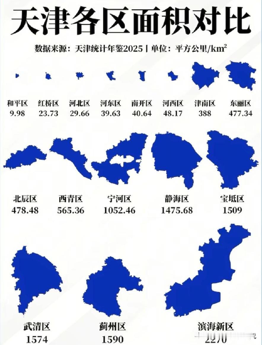 直辖城市天津各区面积大小对比情况图片,天津滨海新区的面积以2270平方公里排名榜一,可见天津各区里滨海新区的面积最大。