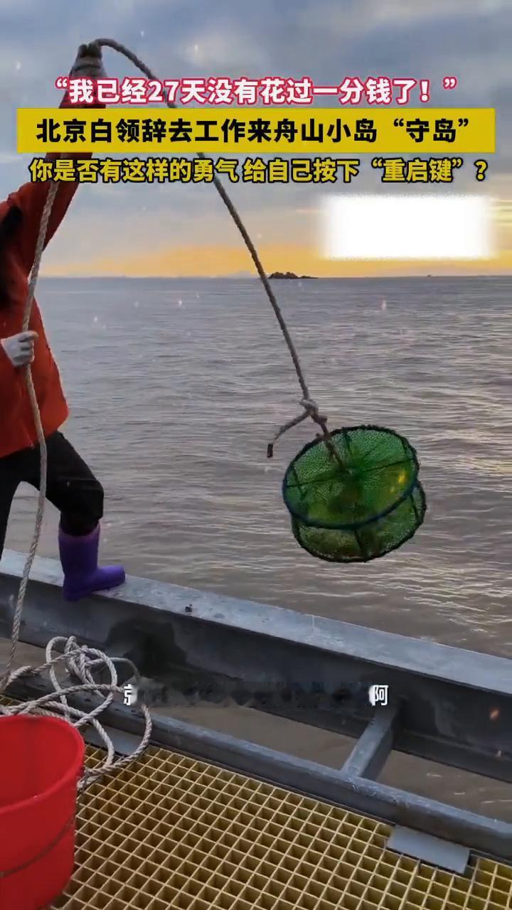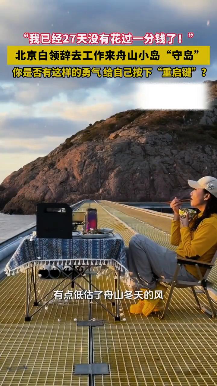 北京白领辞去工作来舟山小岛"守岛",你是否有这样的勇气给自己按下"重启键"? 竞舟新闻原创采访:岳女士。 我已经27天没有花过一分钱了,是在东寨岛,类似于像守岛人都是一些极其简单的工作,就看一看海上的水温,记录一下海上风浪。平时的时候就在海边露营、抓螃蟹,舟山的螃蟹竟然是甜的。7-10天有一次补给船补给,都是公司来提供。 我现在要休整一下,有点低估了舟山冬天的风,那种呼啸的声音真的是比手机软件上的特效都来的猛烈。天气稍微暖一点再回舟山。