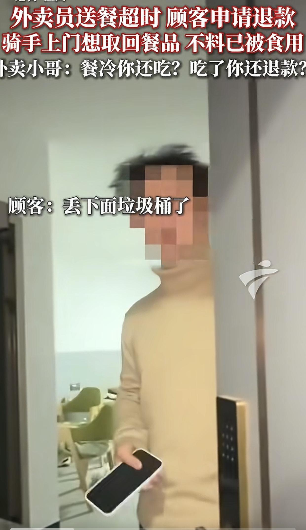 江西,一名男子吃外卖后以餐冷为由申请退款,外卖员上门想取回餐品,男子谎称丢楼下垃