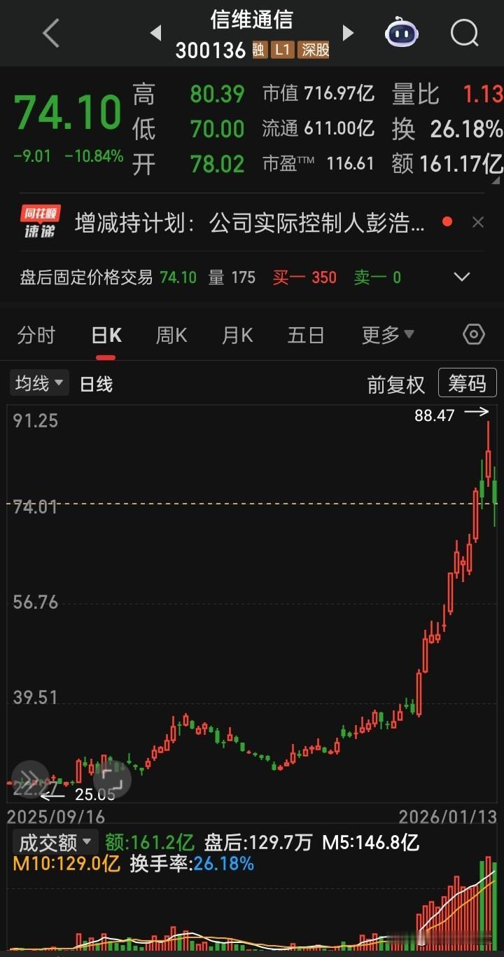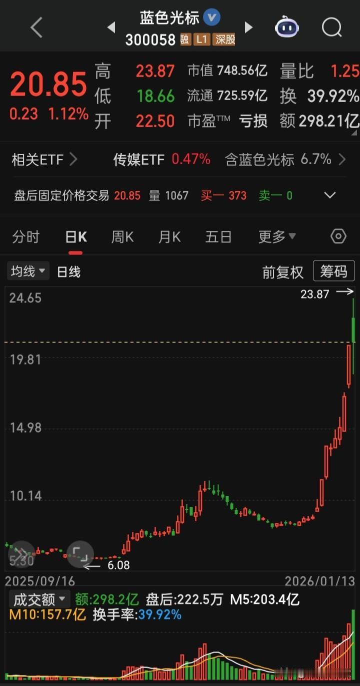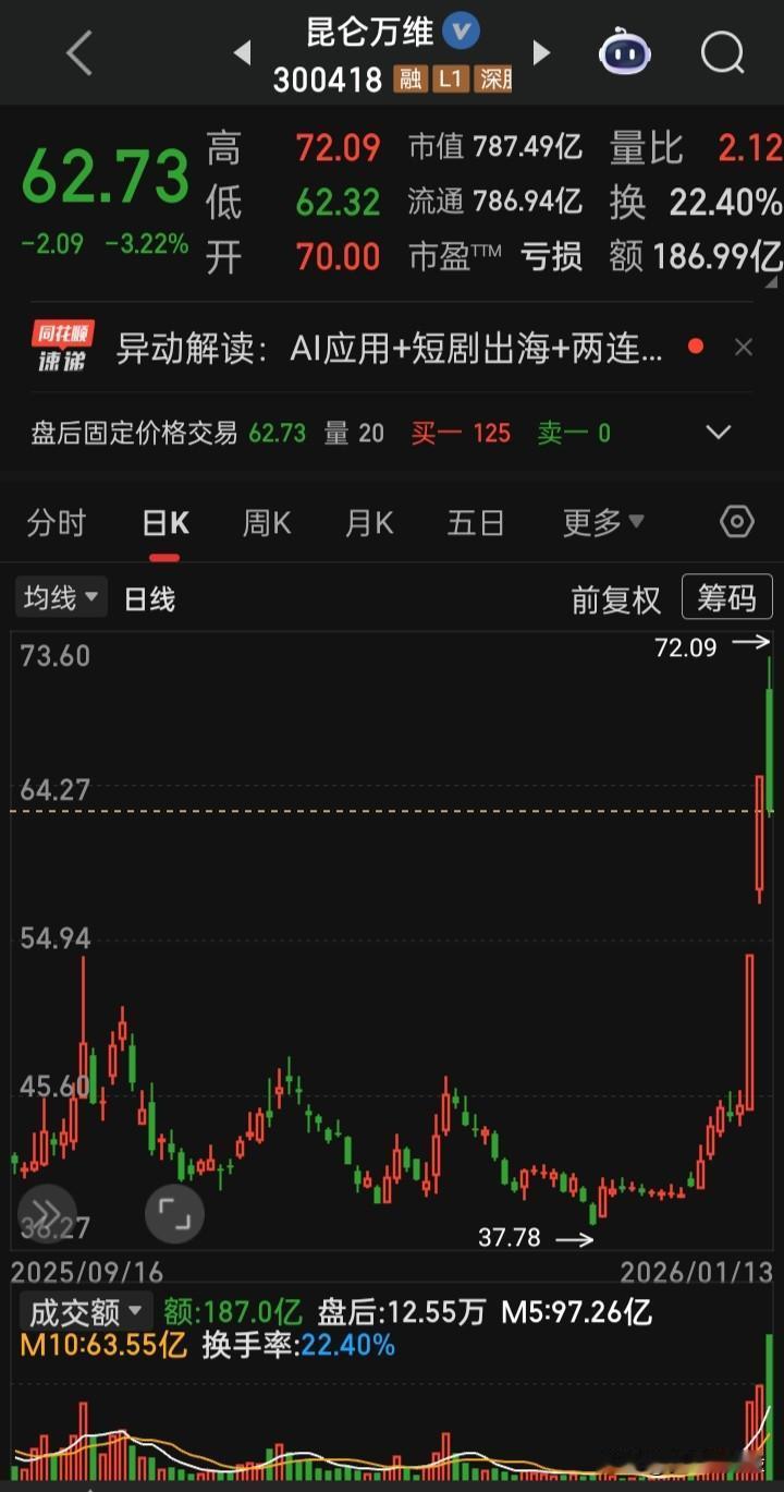 【每日观察,2026.01.13】上证终止在连17阳,A三指日成交总额再创历史记录,在总成交额36987亿比上个交易日增量542亿、上涨1622亿下跌3729家、涨停75家跌停56家的情况下,谁在成交额前十 金凤科技300.89亿,跌3.36% 蓝色光标398.21亿,涨1.12% 岩山科技232.72亿,涨5.27% 中国卫星227.40亿,涨4.17% 航天电子212.48亿,跌停 中际旭创191.08亿,跌1.05% 昆仑万维186.99亿,跌3.22% 三花智控170.34亿,涨0.26% 信维通信161.17亿,跌10.84% 新易盛 155.17亿,跌2.08%