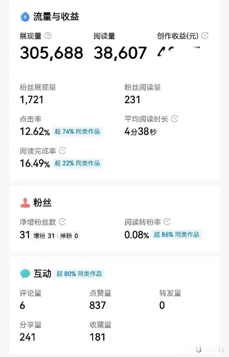爆款、爆品总在不经意间诞生了! 头条给的惊喜总是那么的恰到好处! 上周一篇文章展现30万、阅读量3.8万,千次读单价达到了一块多! 也算是在流量低迷的情况,给了一副强镇剂! 所以写头条, 还是要坚持, 因为只有坚持才会有惊喜, 否则就只剩下一声叹息! 说这些应该玩头条的人都懂吧! 每次都是在快要不管、 不理的时候给你来一点希望, 让人又爱又恨,又欲罢不能!@今日头条