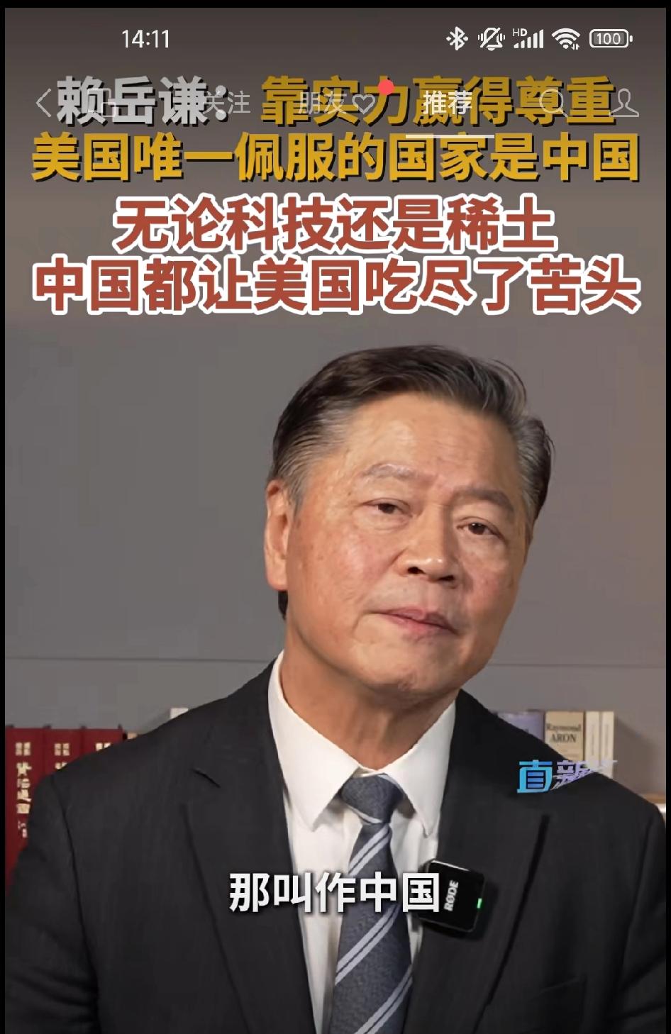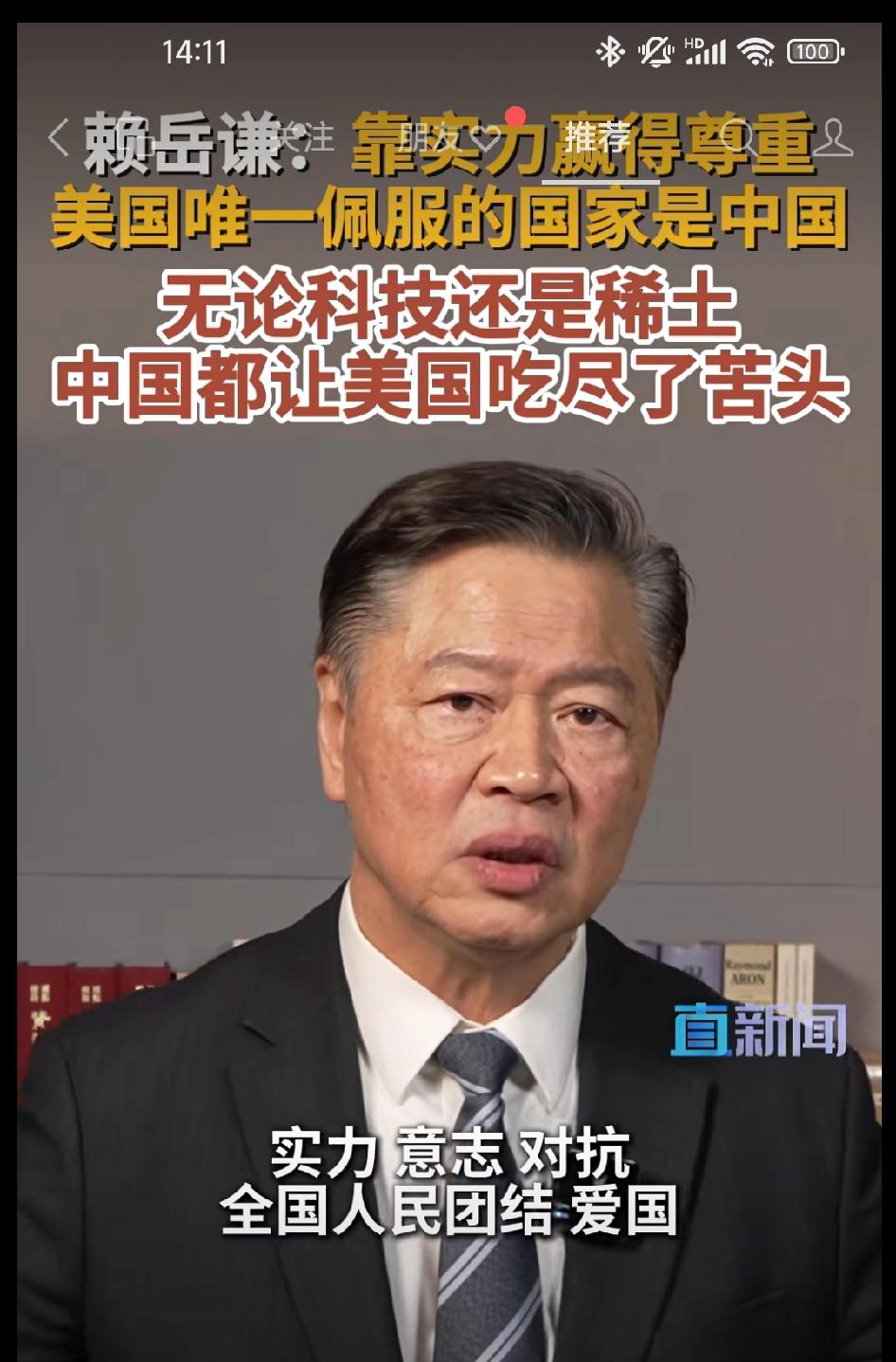赖岳谦教授:靠实力赢得尊重,美国唯一佩服的国家是中国。 中国很明白的知道:实力,意志,对抗,团结,爱国是我们的必要条件。 中国无论科技还是稀土,都让美国吃到了苦头,所以美国愿意坐下来谈,这又是实力原则。