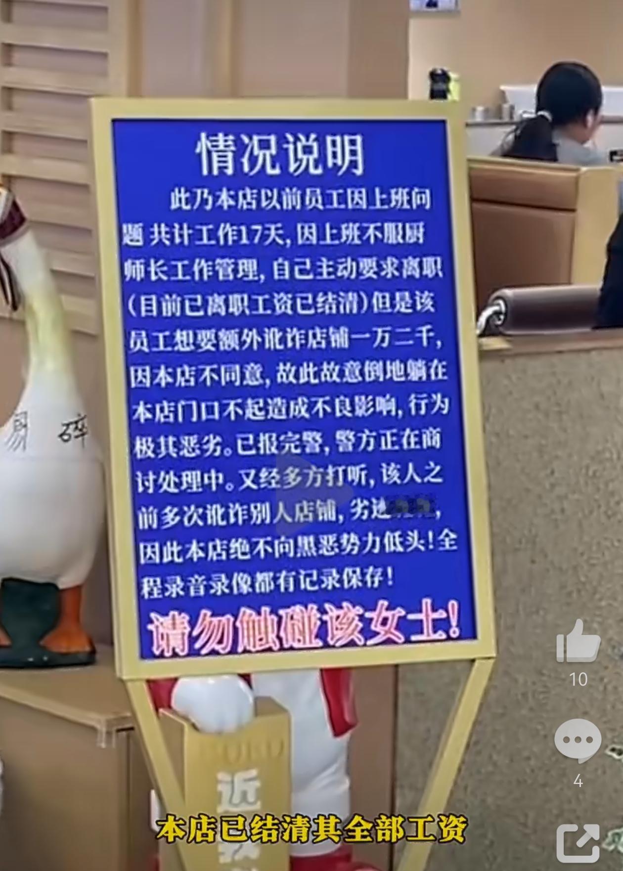 女子趴在饭店门口地上维权,店家立起说明牌。
