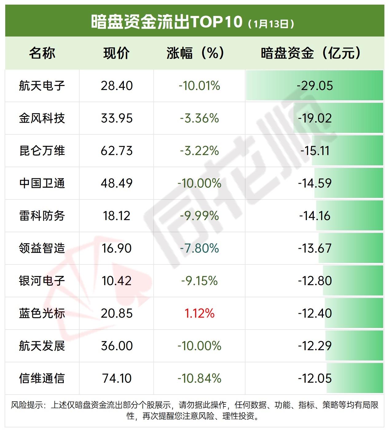 1月13日今日暗盘资金主力流出TOP10,注意风险! 暗盘资金流入活跃,多只个