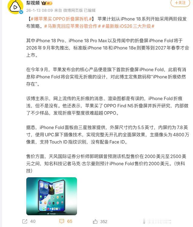 苹果拆机OPPO取经?Find N6要接棒领跑 笑死了,苹果居然买了OPPO折叠屏还拆开来研究?这个消息一传出真的爆了! - 着实没想到苹果也要“反向取经”。但相关消息说,苹果内部其实已经做了好几款iPhone Fold的测试样品,但在折痕平整度上,还是比不上OPPO Find N5,这大概就是苹果要拆它来“取经”的核心原因吧。 网上已经流传出iPhone Fold的保护壳模具,可以看到背部采用横置相机模组,只有两颗摄像头。该款机型整体采用阔折叠屏形态,造型接近iPad mini,内屏7.8英寸+外屏5.5英寸的组合。 - 也不得不说,OPPO在折叠屏领域深耕多年,技术突破有目共睹。据悉下代Find N6也已经在路上,爆料会搭载骁龙8 Elite Gen5处理器、还会升级到5000万+5000万+2亿像素的三摄,并搭载一枚多光谱镜头,拍照能力值得期待。同时,至于折痕,也有望抢先苹果首发无折痕折叠屏,在前代表现这么优秀的前提+产业链优势,大家可以尽情期待一波。 数码科技 手机 折叠屏 苹果折叠屏 iPhone